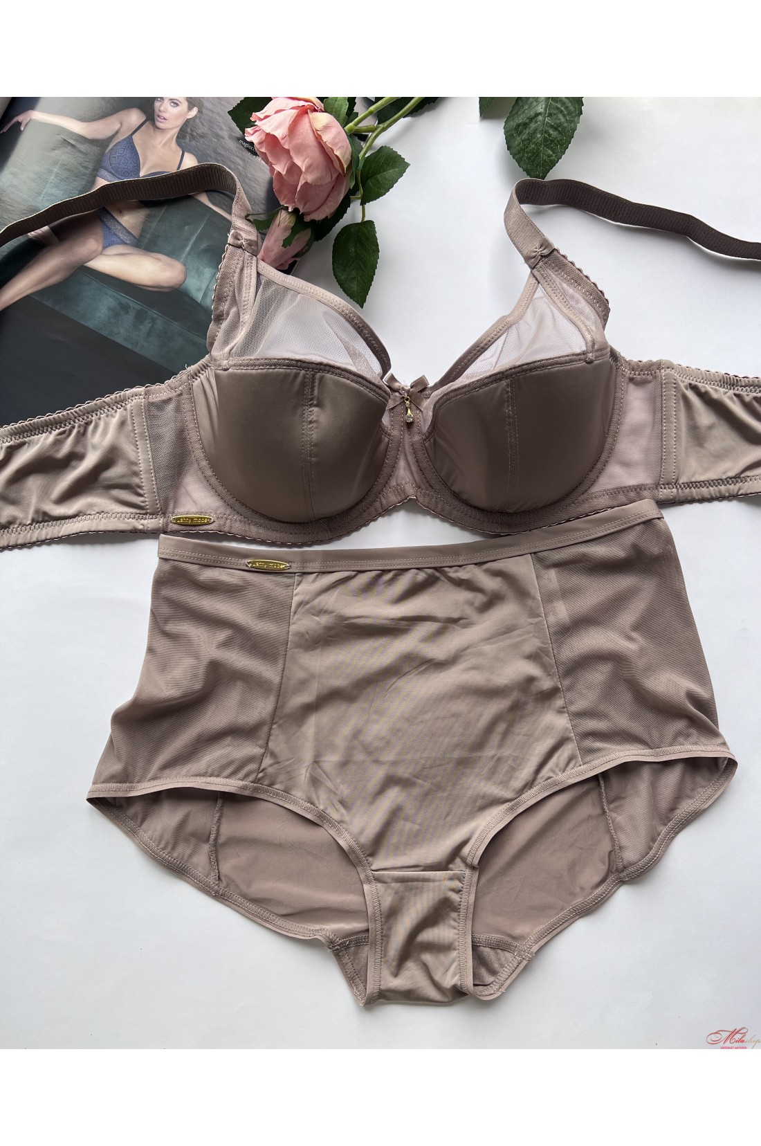 Бюстгальтер на кісточках, чашка виготовлена з напівпоролону і верхня частина прикрашена гарним сітчастим полотном. За рахунок своєї конструкції бюстгальтер добре тримає груди. Трусики сліпи з мікрофібри та сітчастого полотна.