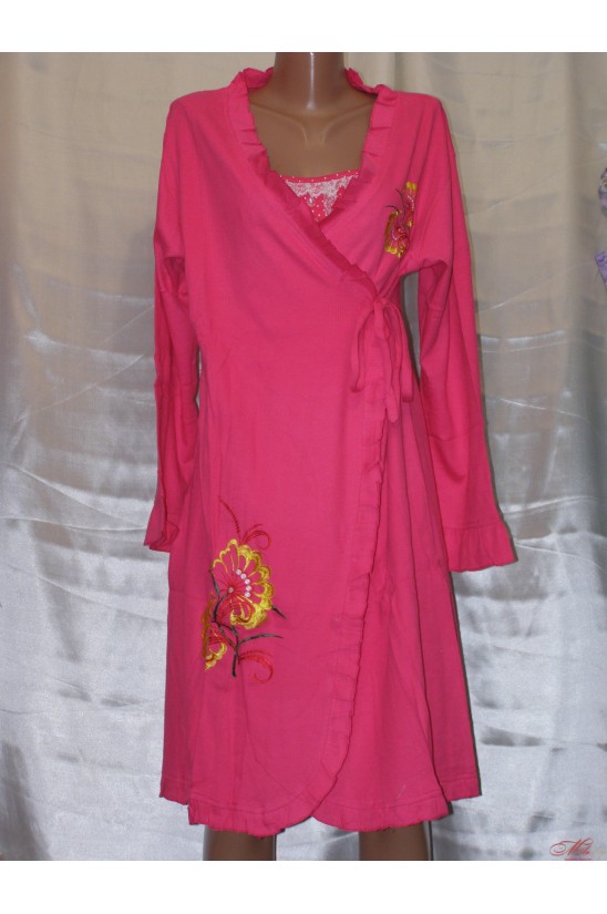 Женский халат из хлопка. Длина до колена, длинный рукав. Спереди украшен цветочной вышивкой.