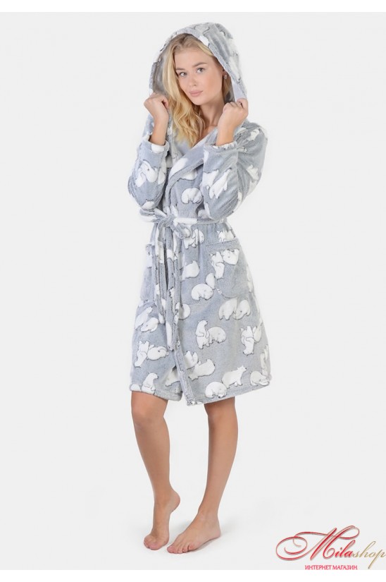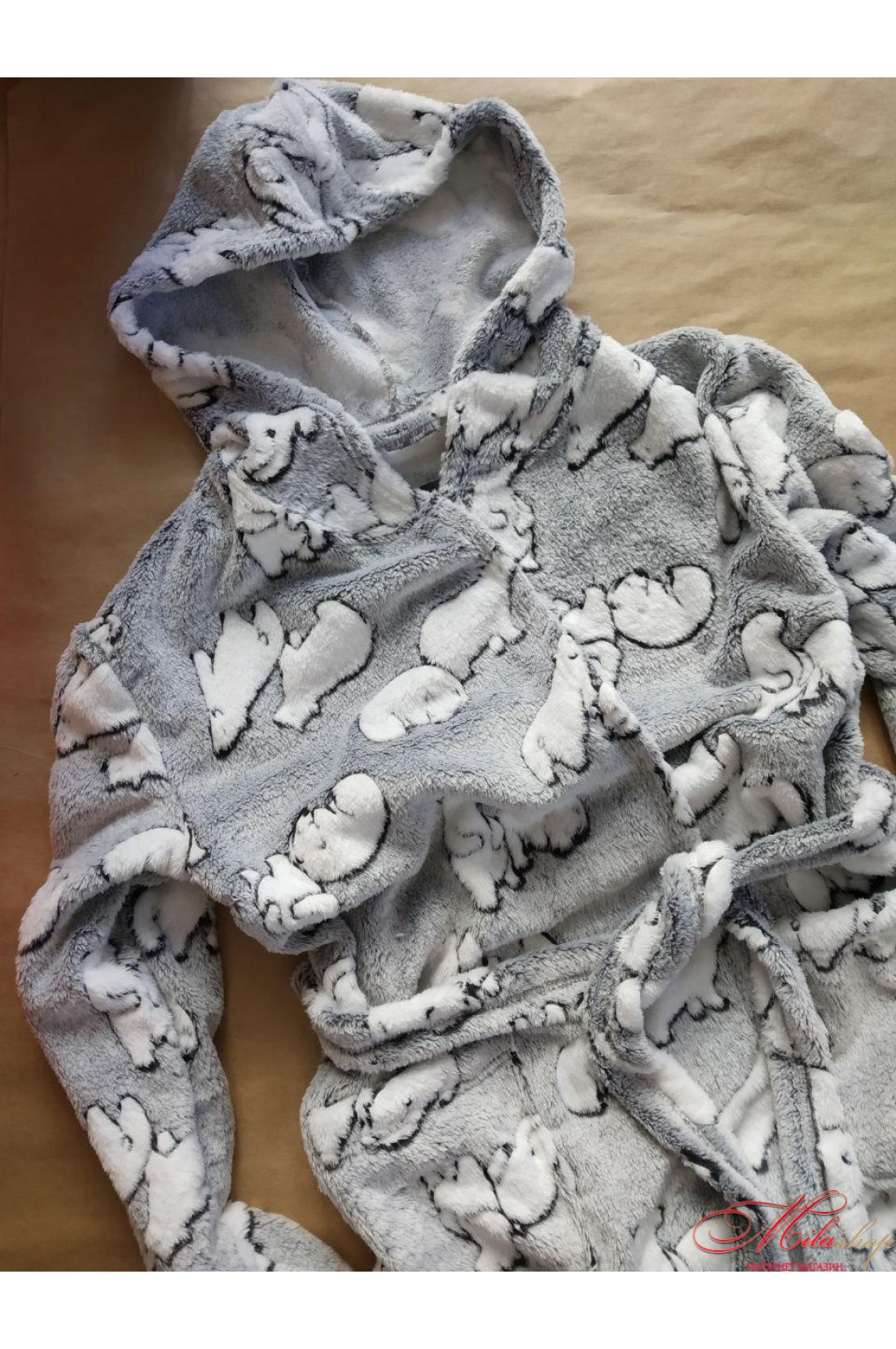 Дуже теплий і м'який жіночий халат у сірому кольорі з білі ведмедики. Відмінний варіант для холодної пори року. Склад: 100% велсофт.