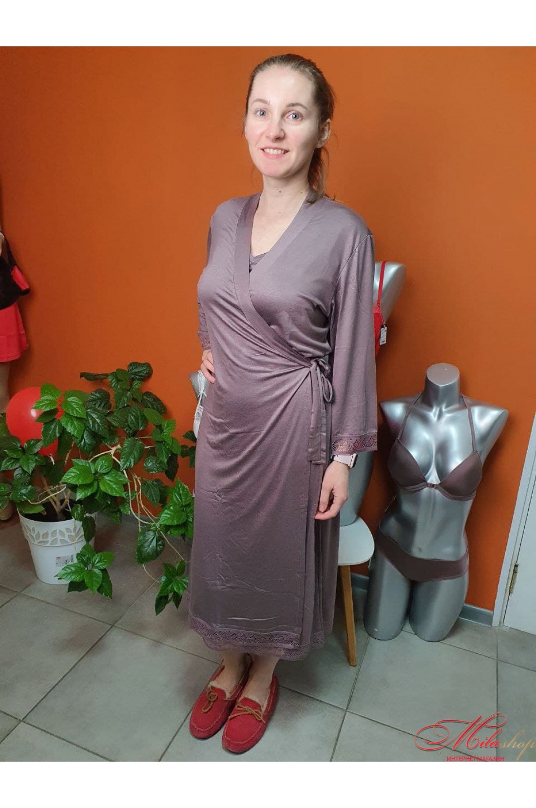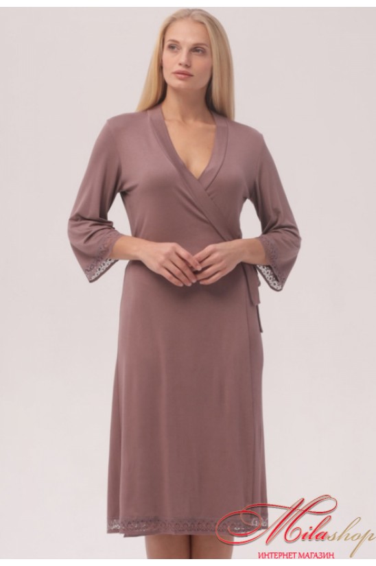 Елегантний легкий халат із найніжнішої віскози. Халат прямого силуету нижче коліна, прикрашений мереживними вставками. Рукав 3/4, V-подібний виріз, виріб запахується на пояс.