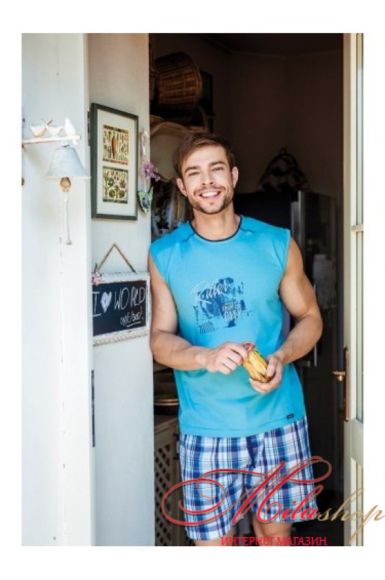 Удобная и комфортная мужская пижама из нежного дышащего хлопка. Футболка с принтом на груди, без рукавов. Шорты из тонкой хлопковой, клетчатой ткани с карманами, длина до колена.