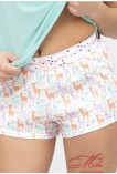 Піжама виконана з м'якої та якісної бавовни, складається з майки бірюзового кольору в тонку білу смужку та коротких шортів білого кольору в принт чарівних різнокольорових лам. Майка напівприлеглого силуету на широких бретелях з круглим вирізом горла, шорти з м'якою гумкою в поясі. Виріз та пройми рукава майки прикрашені кантом у тон шорт. Піжама дуже красива, легка та комфортна.