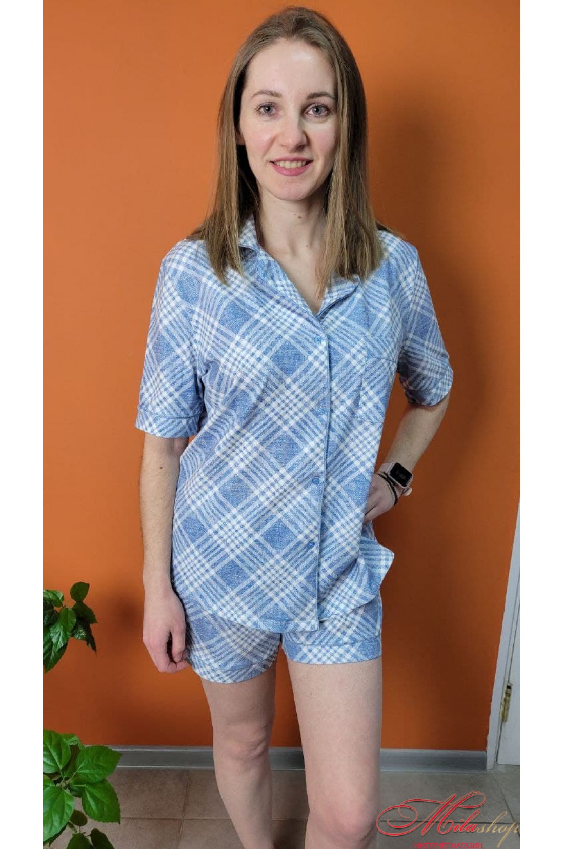 Піжамка в клітинку виконана з м'якої та якісної бавовни, складається з сорочки з коротким рукавом та шорт. Футболка вільного силуету з короткими рукавами, прямі шорти з м'якою гумкою в поясі. Піжама дуже легка та комфортна.