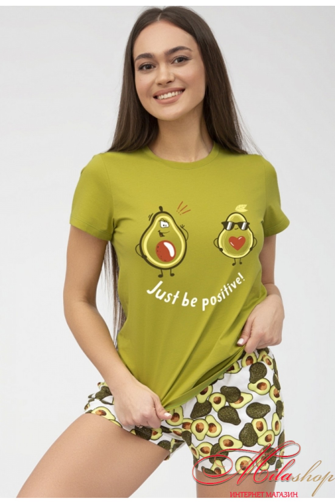 Пижама выполнена из мягкого и качественного хлопка, состоит из футболки зеленого цвета и белых шорт в принт авокадо. Футболка свободного силуэта с короткими рукавами и круглым вырезом горла, шорты прямые с мягкой резинкой в поясе. Спереди по центру футболка украшена принтом двух мультяшных авокадо. Пижама очень легкая и комфортная.