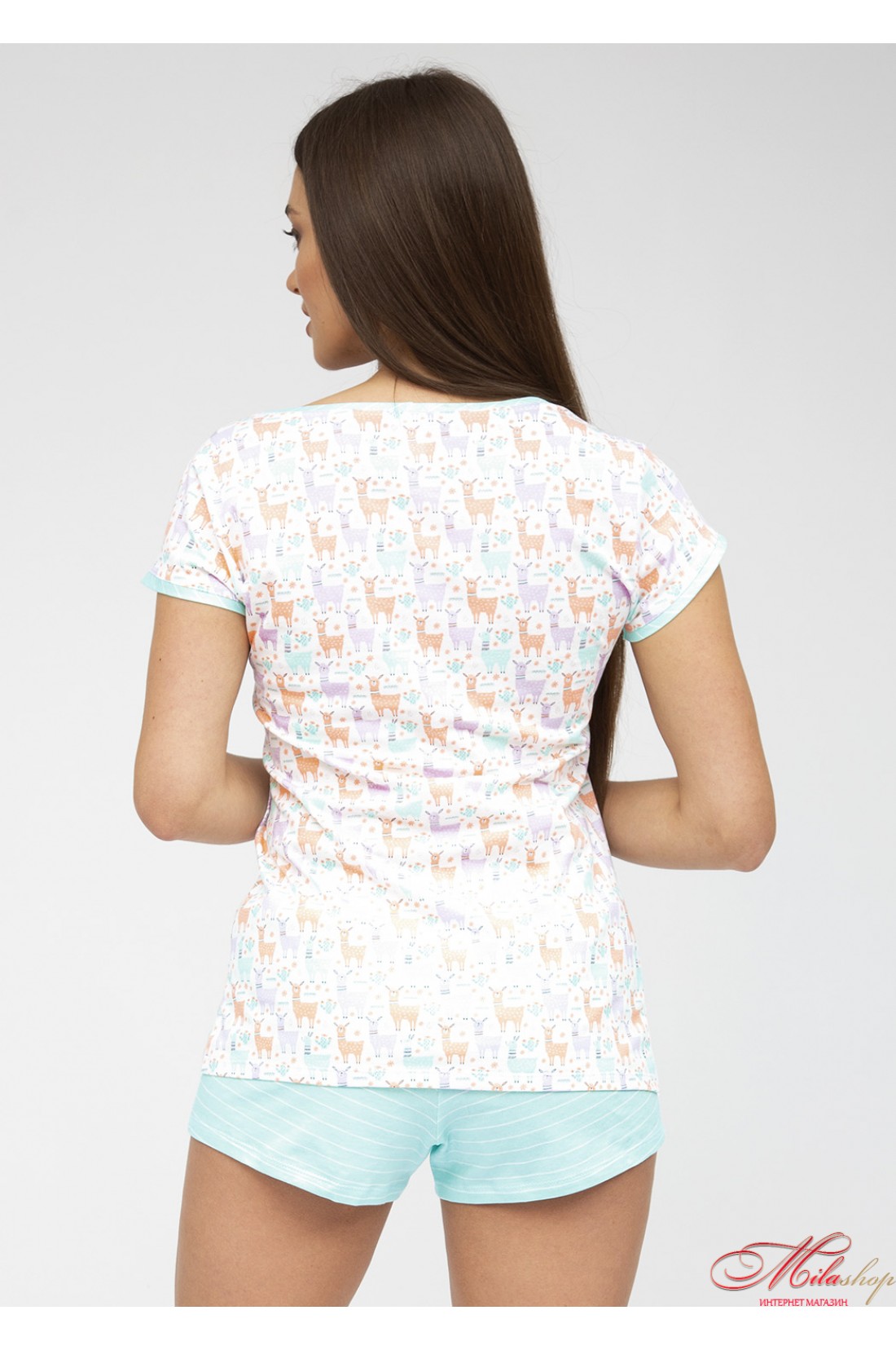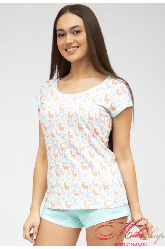 Піжама виконана з м'якої та якісної бавовни, складається з футболки білого кольору в принт чарівних різнокольорових лам та коротких шортиків бірюзового кольору в тонку білу смужку. Футболка напівприлеглого силуету з короткими рукавами та круглим вирізом горла, шорти з м'якою гумкою у поясі. Виріз та рукави футболки прикрашені кантом у тон шорт. Піжама дуже красива, легка та комфортна.