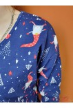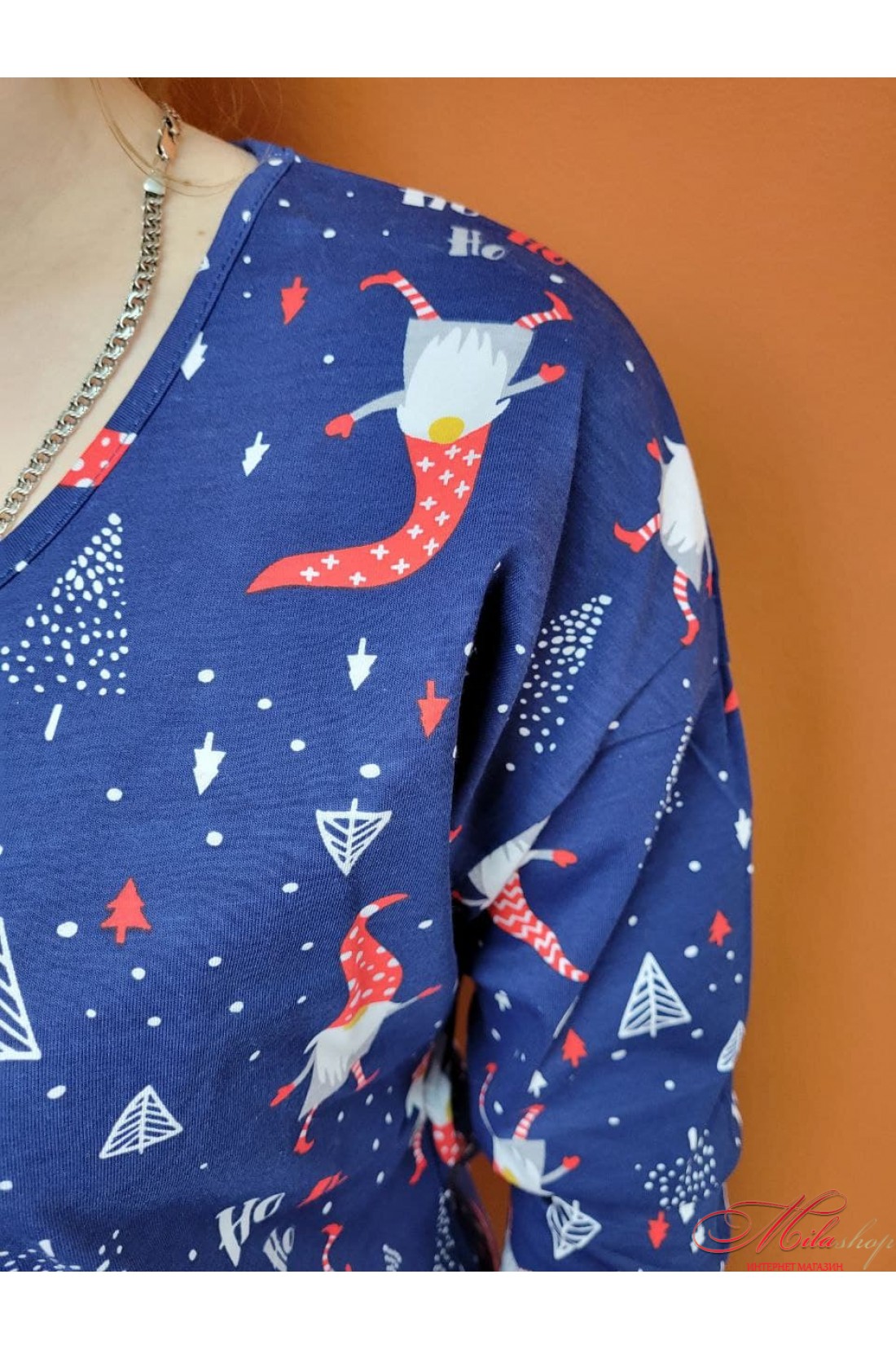 Ночна сорочка виконана з м'якої та якісної бавовни синього кольору з принтом мультяшний дід Мороз та ялинки. Модель вільного силуету довжиною вище колін, з круглим вирізом горла та рукавами 3/4. Ніч дуже гарна і комфортна.