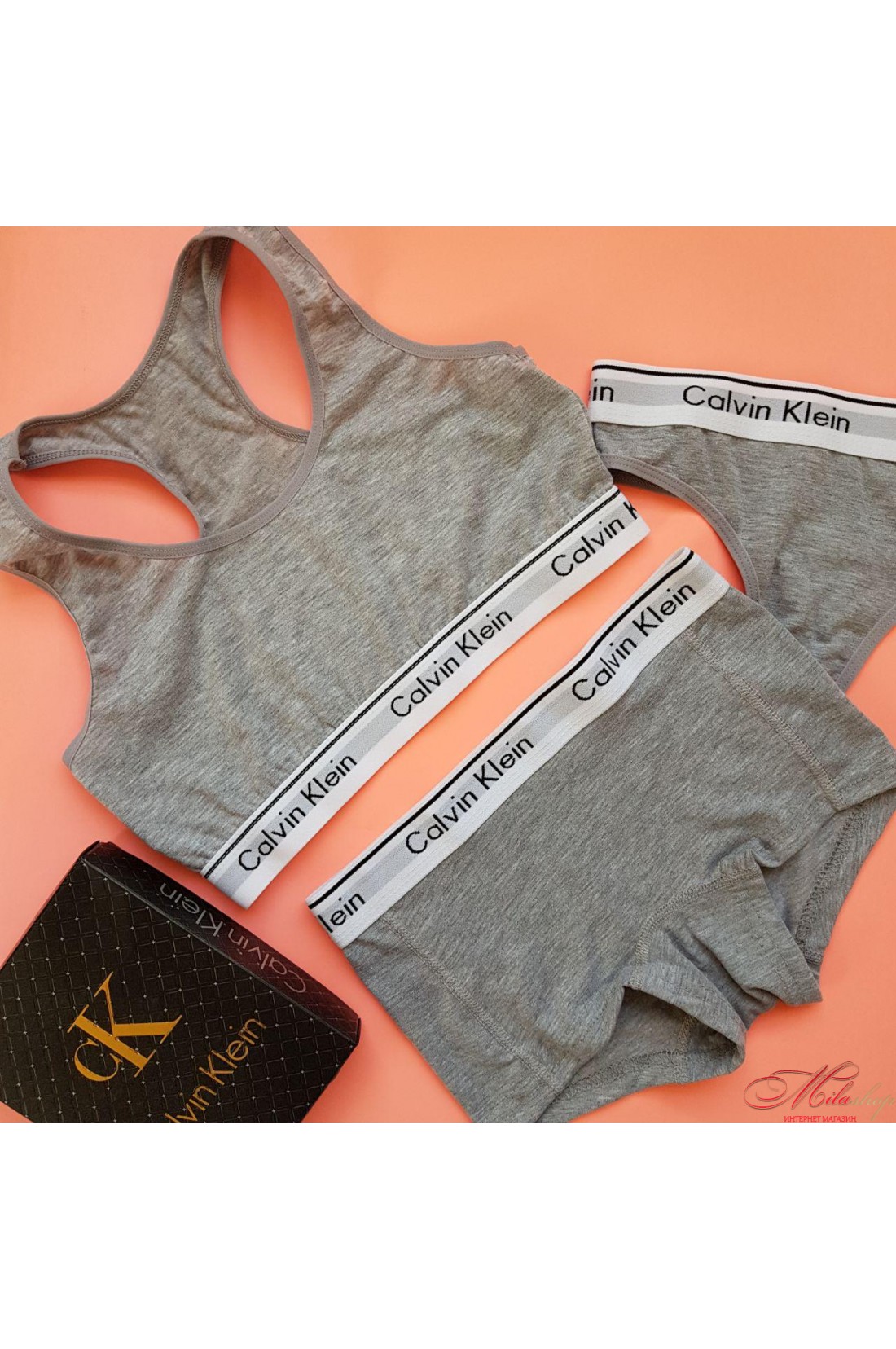 В набор входят: топ, трусики-стринги, трусики-шортики. Комплект упакован в красивую коробку с брендированной надписью. Размеры: s, m, l, xl. Цвета: серый, черный.