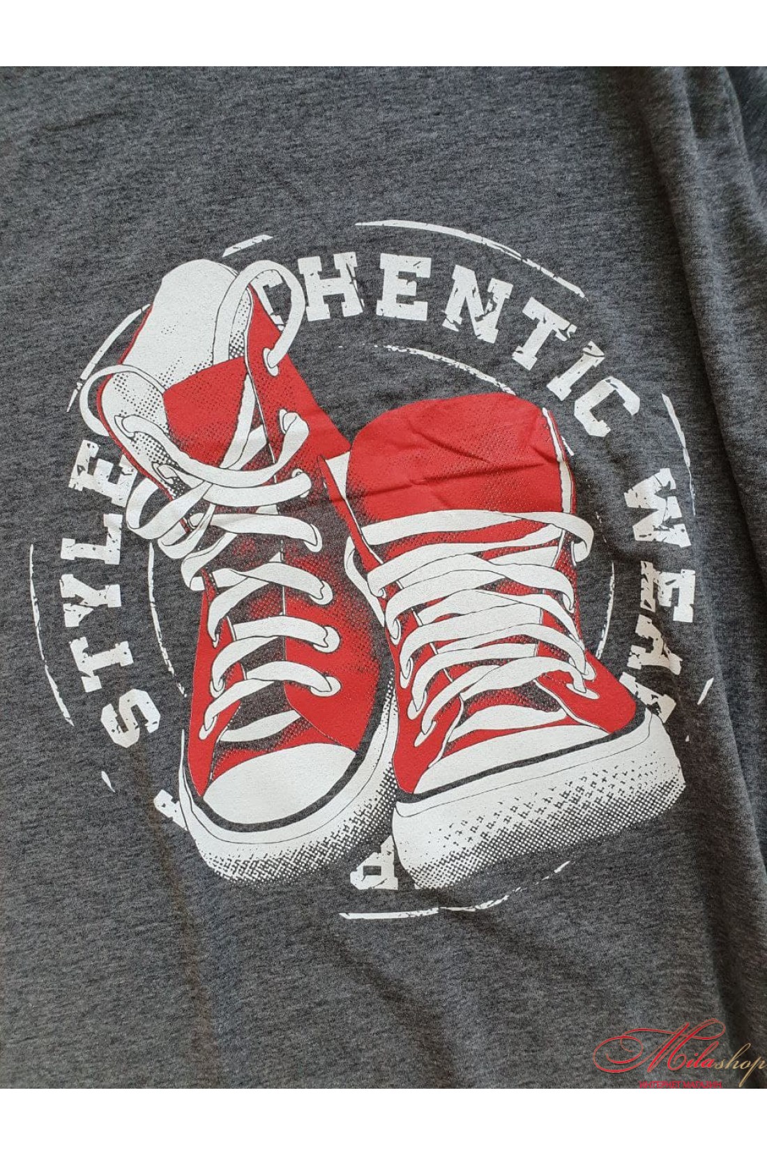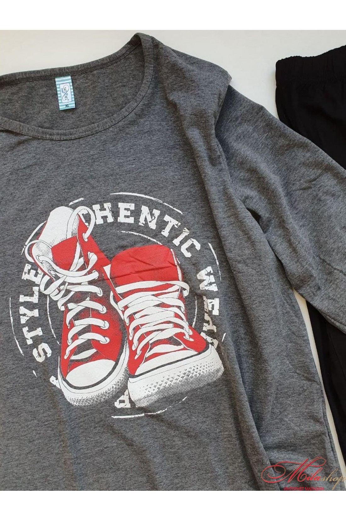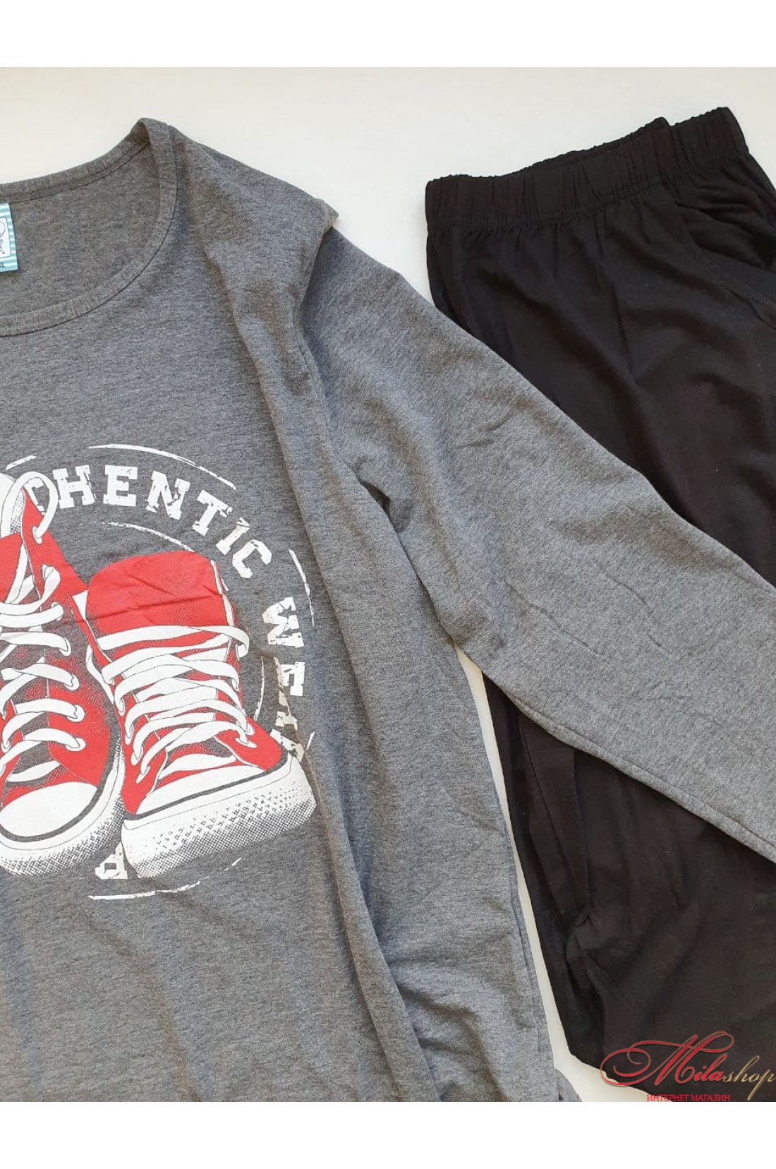 Комфортная мужская пижама. В комплект входит серый джемпер с принтом и черные штаны с карманами.