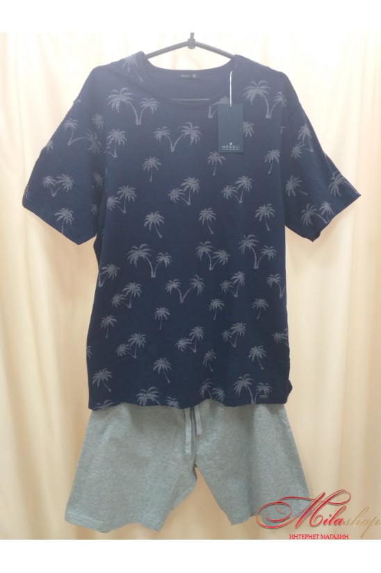 Комфортная мужская пижама. В комплект входит футблока с коротким рукавом и шорты длиной до колена. На верхней части принт, крой приталеный, шорты свободно сидят на теле.
