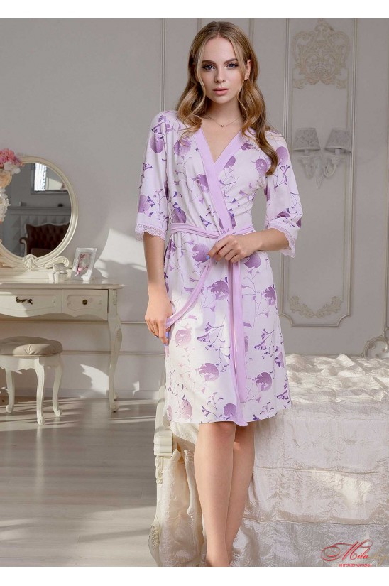 Утончённый халат из мягкой вискозы на запах. Полуприлегающий свободный силуэт. Подобранный в тон поясок изящно подчеркнёт талию. Длинна изделия чуть выше колена, рукав ¾. Такой домашний халат не требует особенного ухода, удобный в носке, невероятно качественный и легкий.