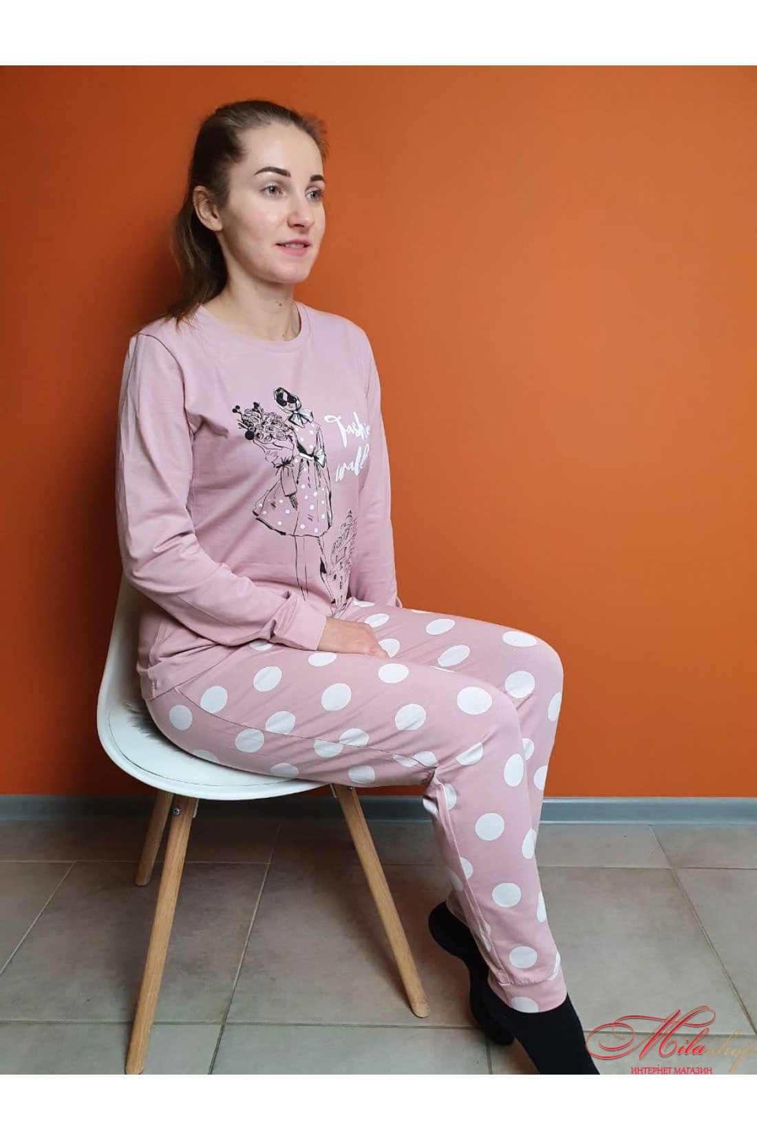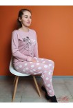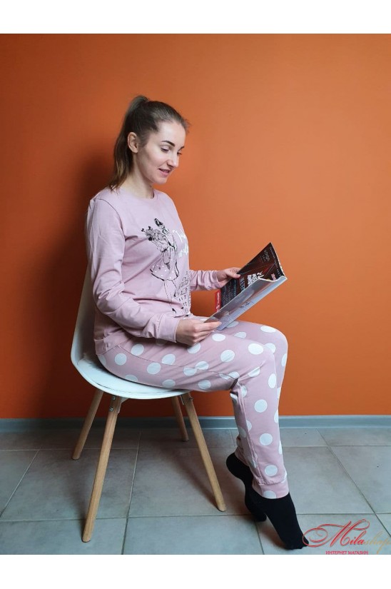 Невероятно комфортная женская пижамка. Рукава джемпера и низ штанишек на манжетах. Пижама в пудровом цвете. Кофта с контрастным принтом, штаны в светлый горох.