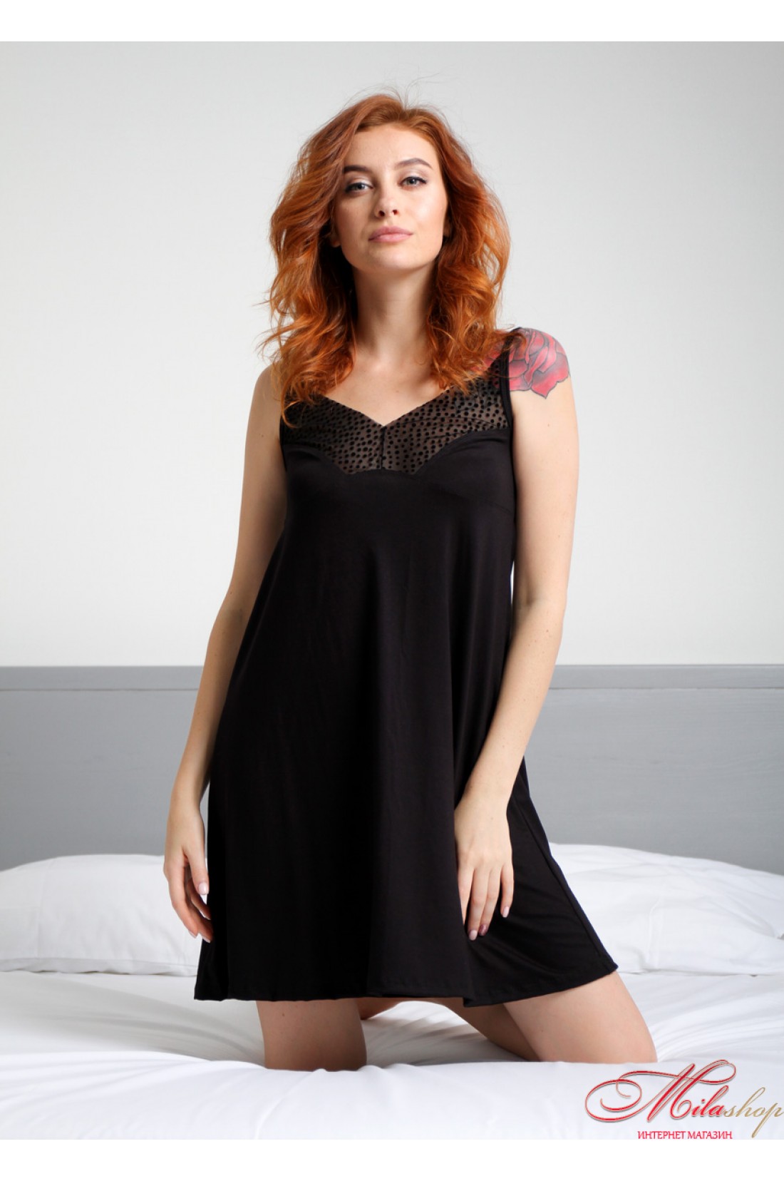 Черная ночнушка из вискозы длинной до колен, на узких регулируемых бретелях. Рубашка трапецеевидного кроя, что скрывает животик. В качестве декора зона декольте украшена сеткой с флоковым напылением. Низ сорочки обработан оверлоком, благодаря чему формируется красивая волна по краю.