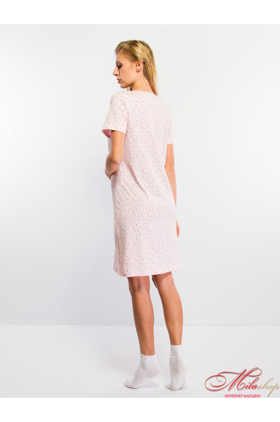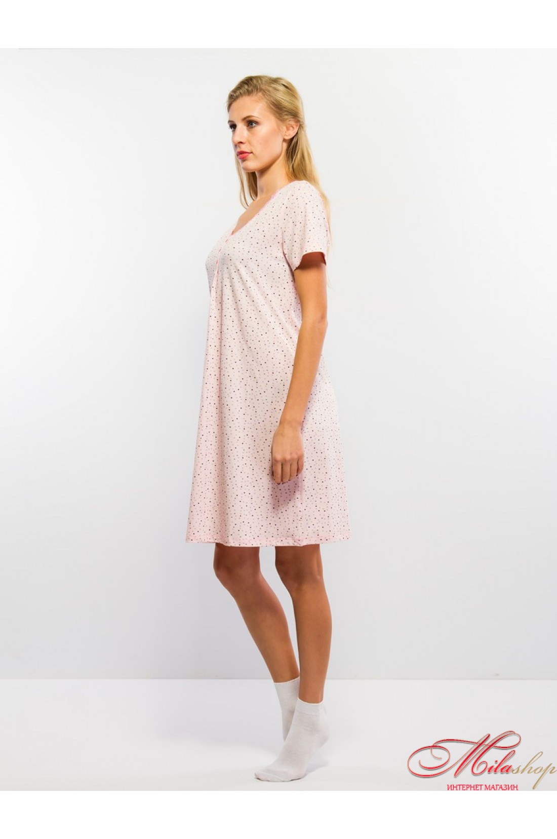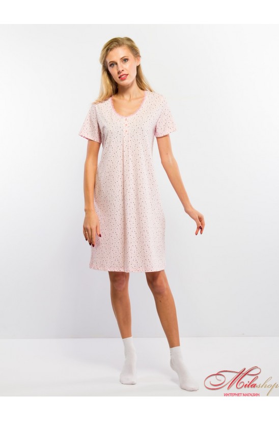 Элегантная женская сорочка с рисунком в нежные звездочки. Спереди украшена тонким кружевом. Изготовлена из натурального трикотажа с небольшим добавлением эластана (5%).