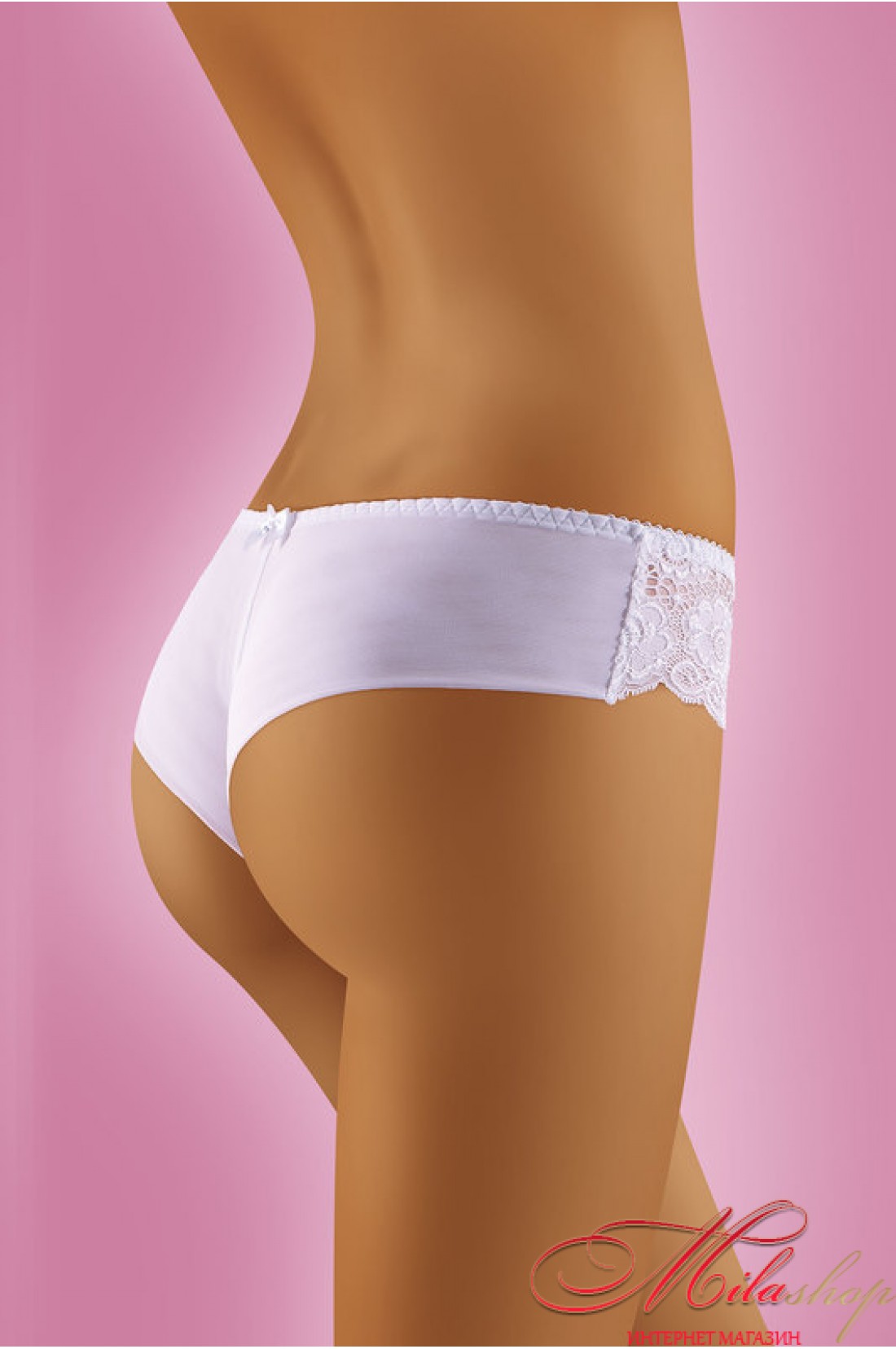Женские трусики-бразилиана. Передняя часть выполнена в виде широкого кружевного пояса, задняя часть из эластичной микросеточки без швов.