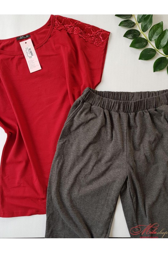 Комплект женский, выполнен из натурального хлопкового полотна с добавлением эластана. Комплект состоит из футболки декорированной кружевом на плечах и бридж.