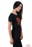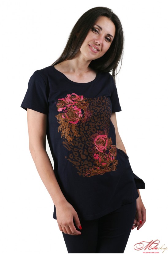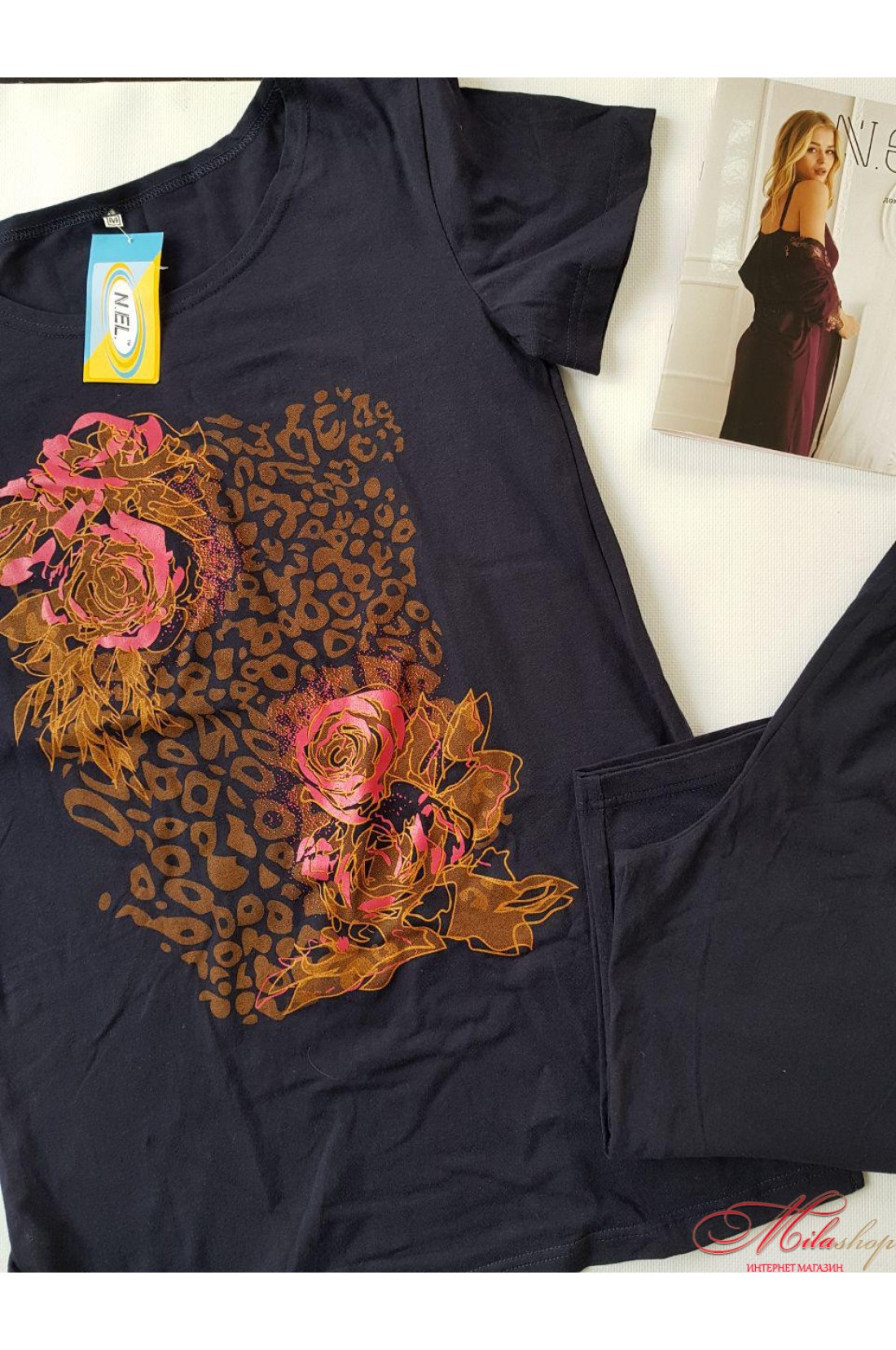 Темно-синий женский комплект из качественного турецкого стрейч-кулира, состоящий из облегающих бриджей и туники свободного кроя, с коротким рукавом и цветочным принтом. Материал хорошо тянется и пропускает воздух. Состав: 95% хлопок 5% эластан
