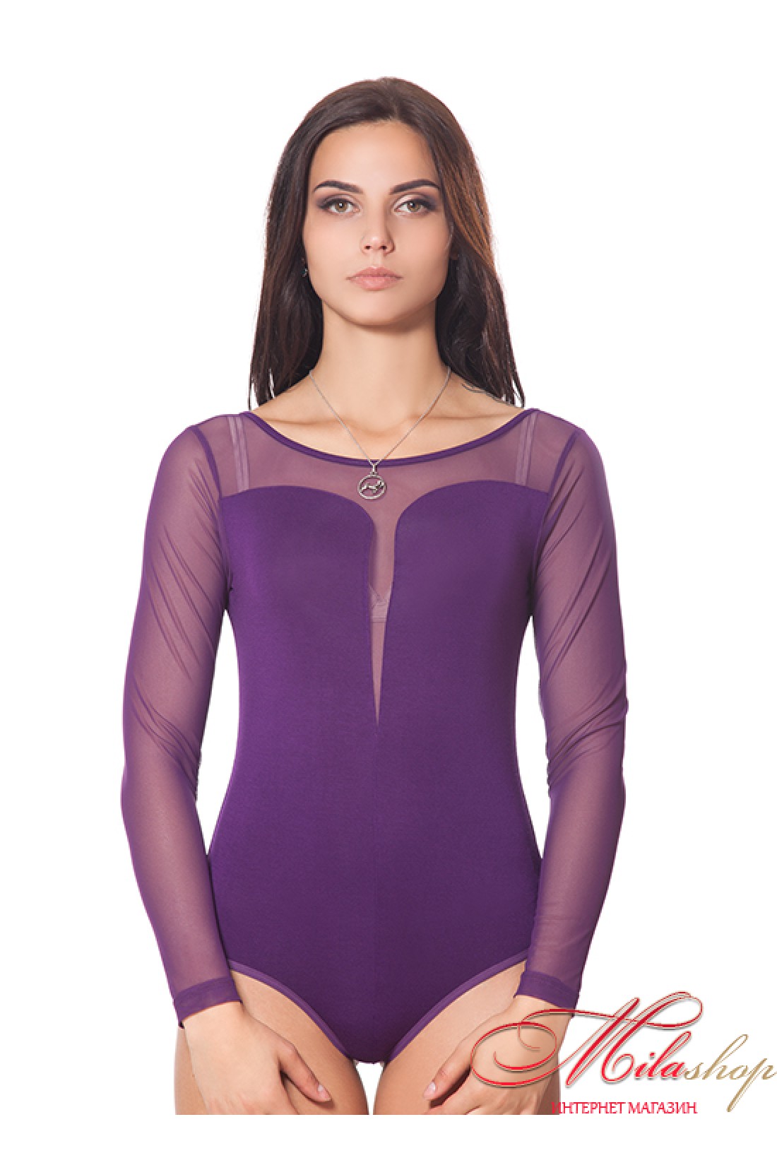 Женское эффектное боди, выполнено из мягкого трикотажа. Изделие с длинными рукавами из сетчатого материала и округлым вырезом горловины.