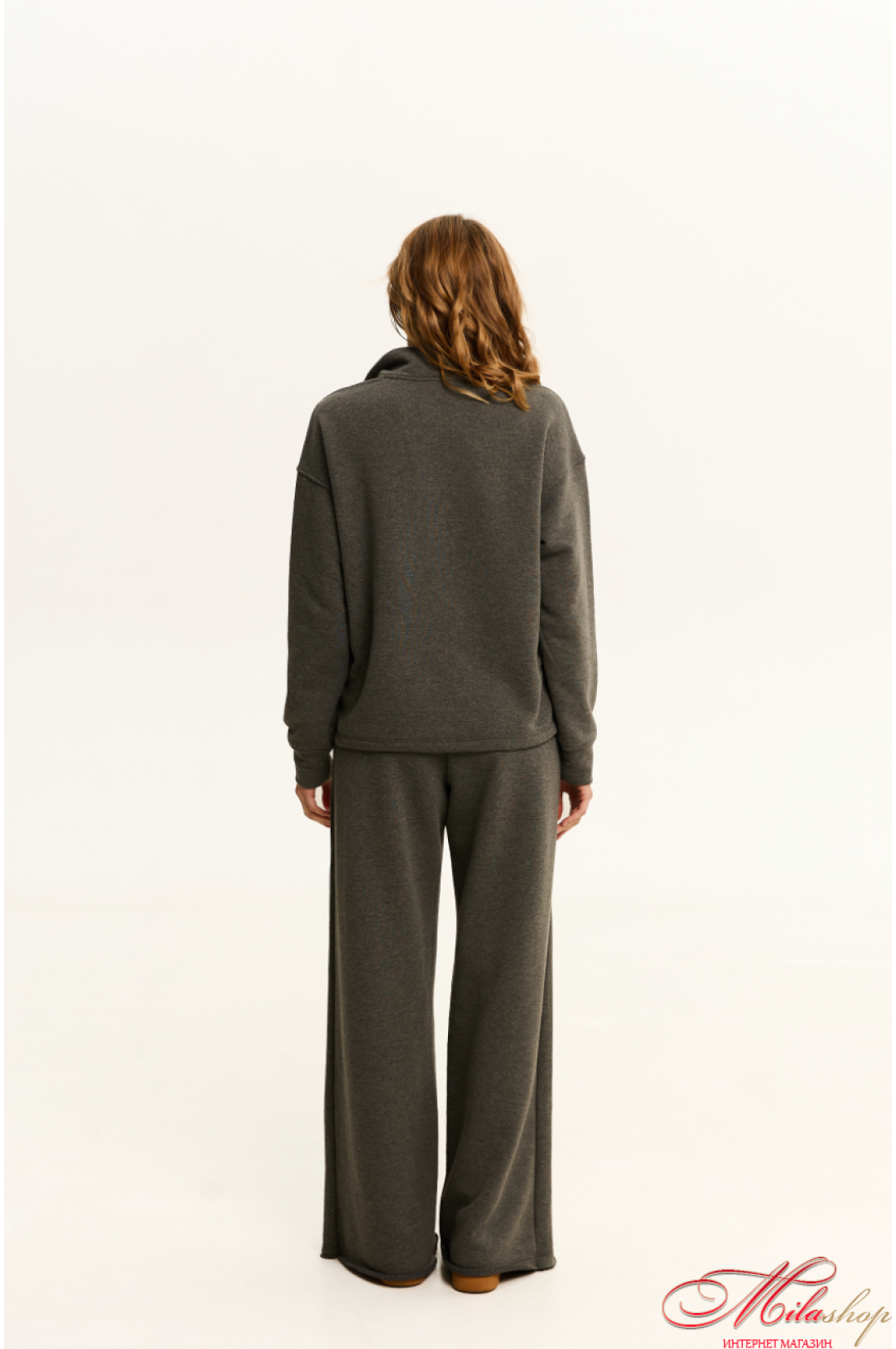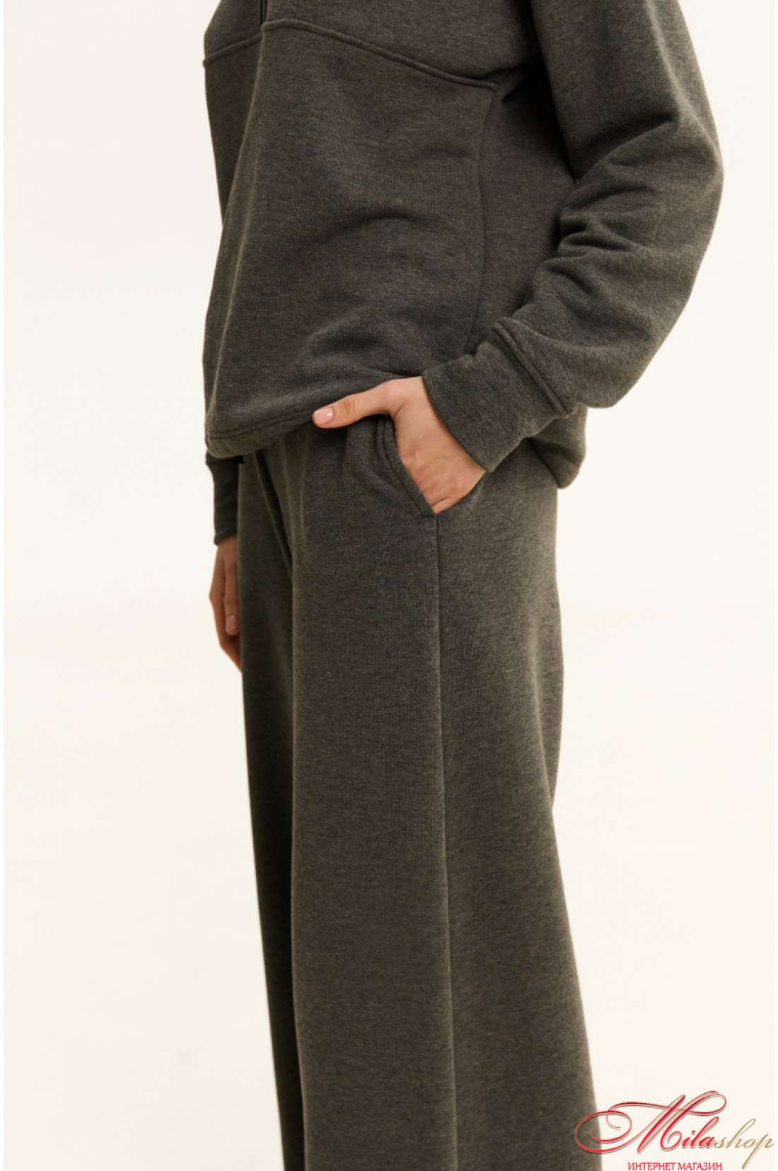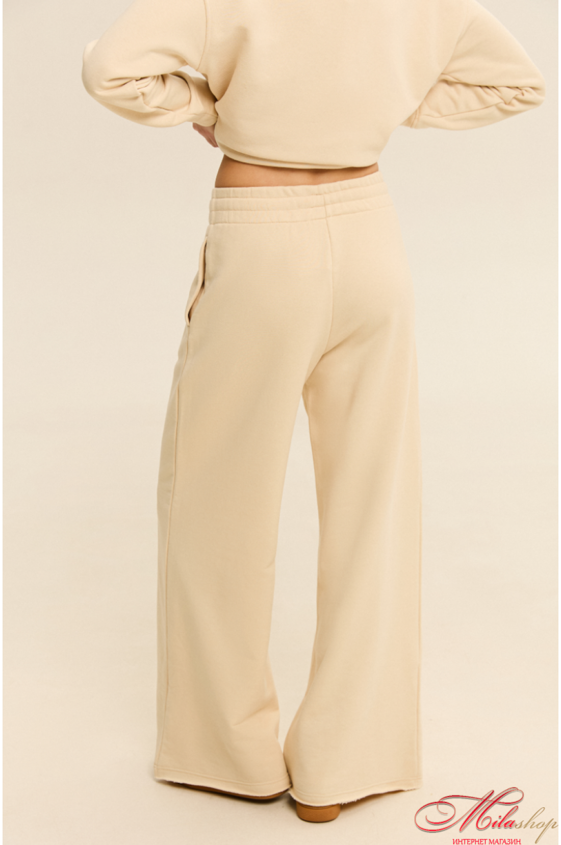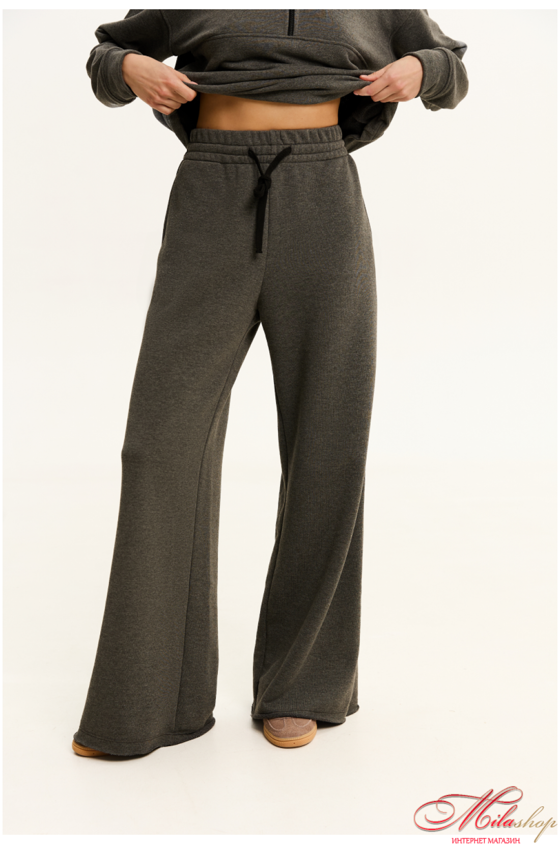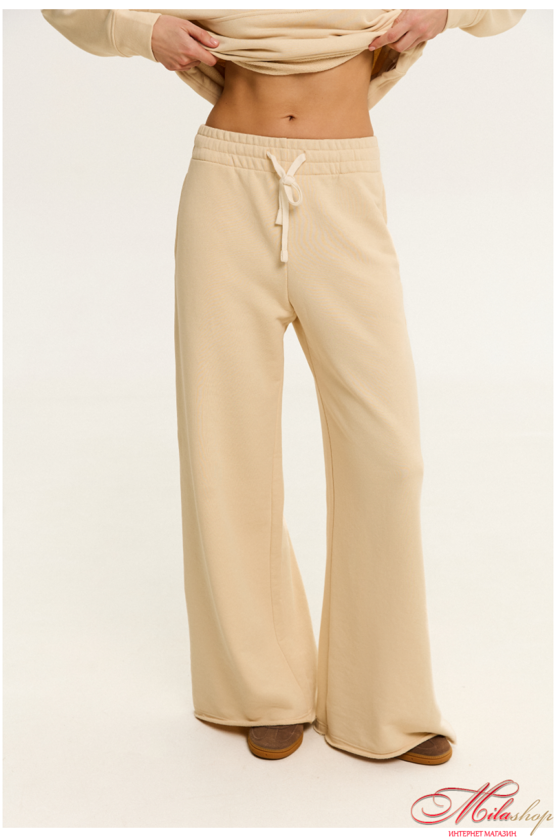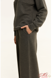 Комфортні штани, стильного силуету розширеного до низу, що чудово підійдуть для прогулянок та повсякденного життя. Пояс цільнокроєний, шириною 6 см, з мʼякою комфортною резинкою, та плоским шнурком. в боковому шві кишені, низ штанів має цікаву обробку, з відкритим зрізом. Тканина мʼяка тринитка, середньої товщини, без начосу. Рекомендації по пранню: при 30 градусах, з подібними кольорами.
