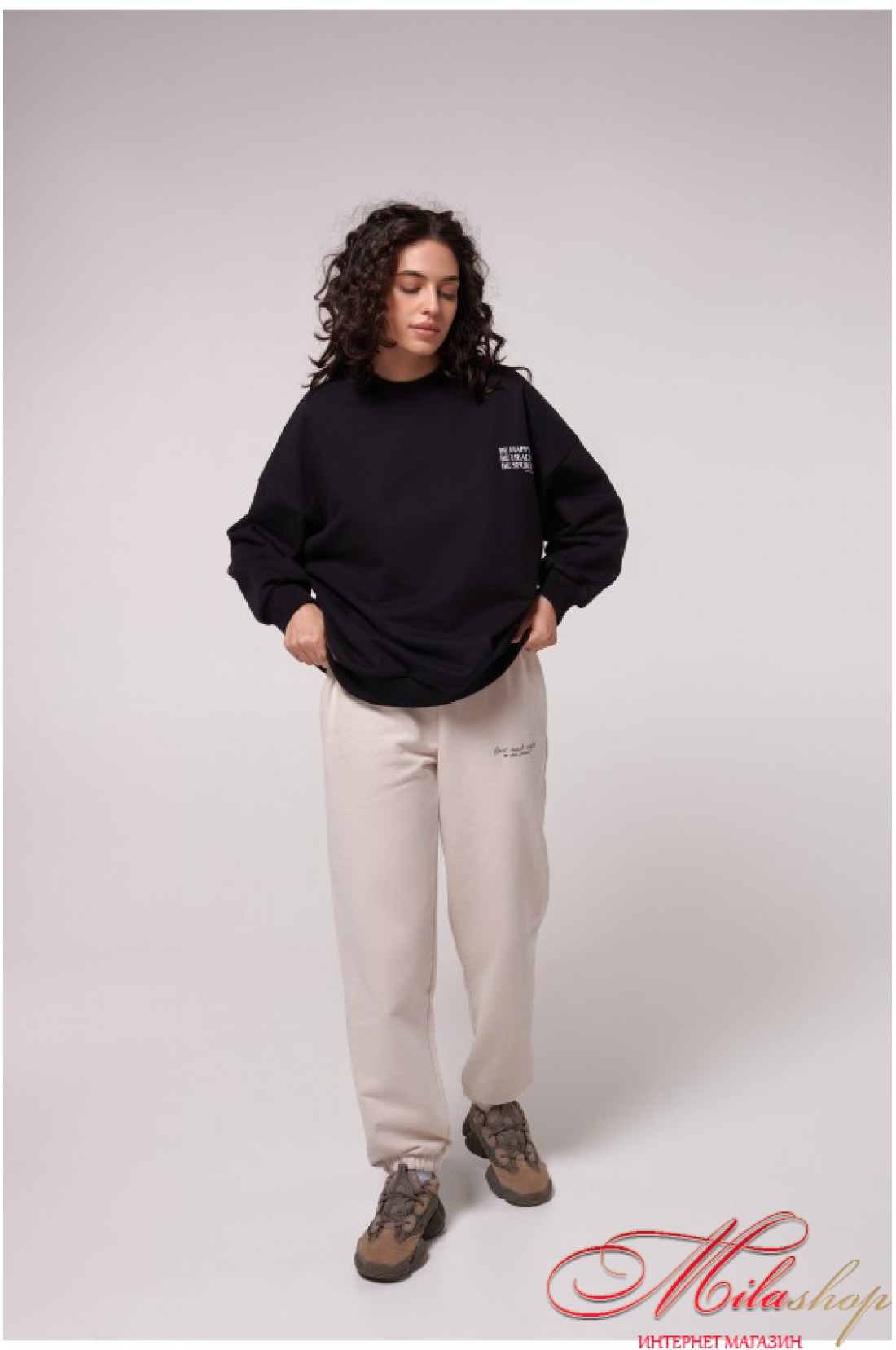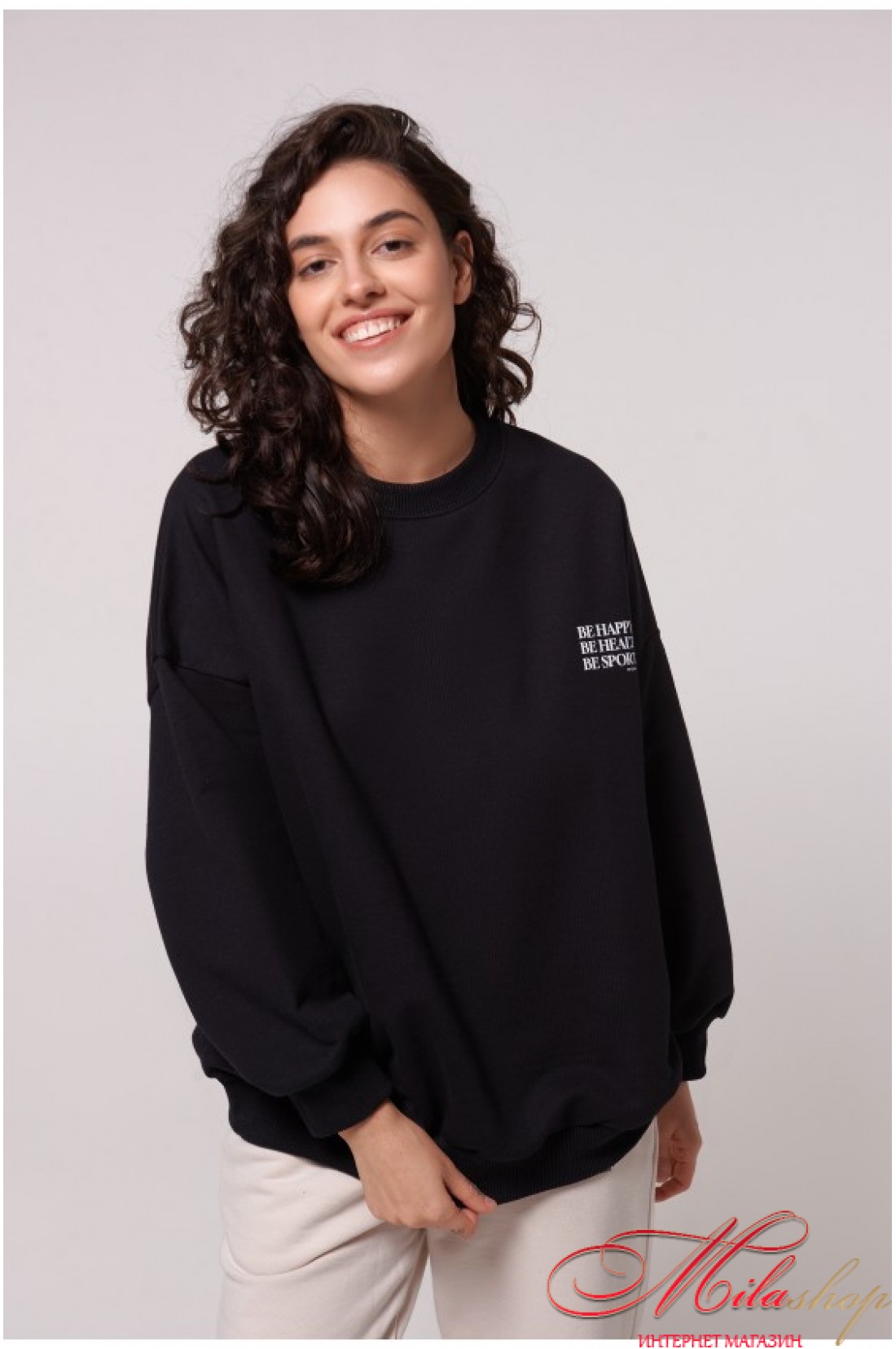 Трендовий вільний світшот з круглим високим коміром та завуженим нижнім кантом конструкціі оверсайз. Універсальна річ під будь-який образ гардеробу (джинси, лосіни, велосипедки, джогери тощо). Рукав вільного крою, спущене плече.