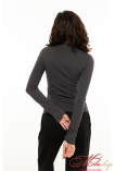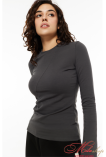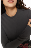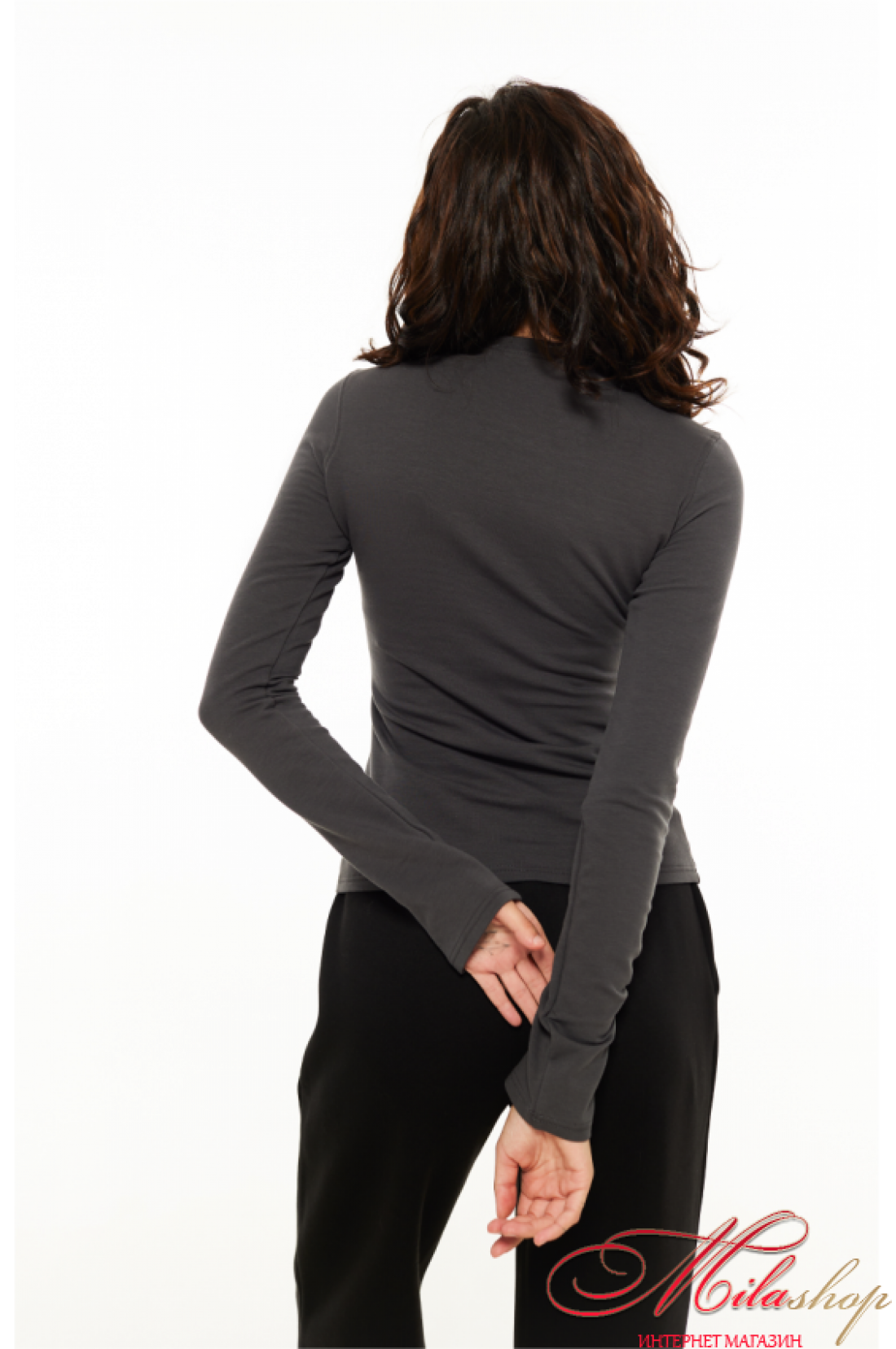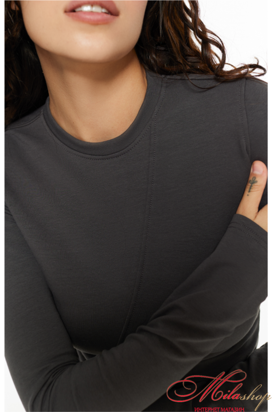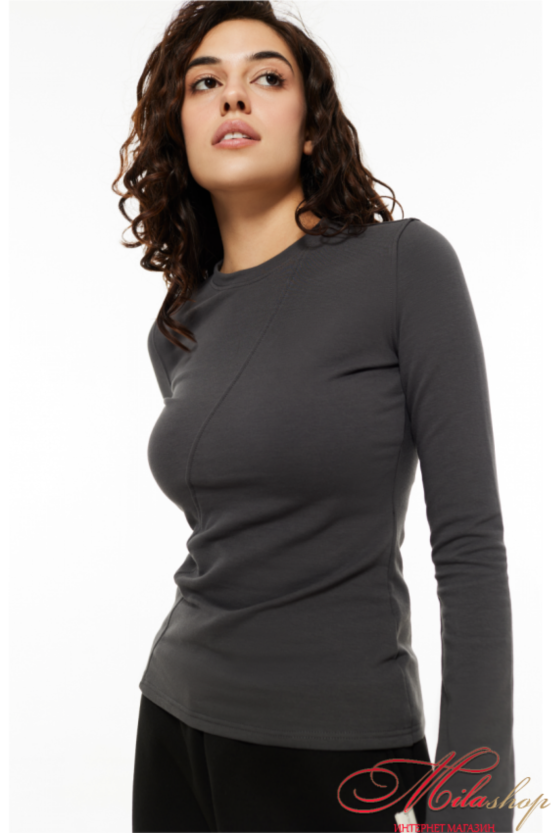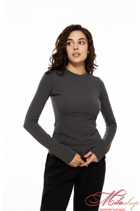 Лонгслів приталений прикрашений косим вертикальним швом. Комір високий та округлий. Тканина має технологію виробництва – двунитка, але утеплена флісовим начісом.