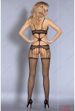 Оригинальный кэтсьюит из сетчатого материала. Модель объединил бюстгальтер с открытыми чашечками, пояс с пажами и чулки, соединенными между собой эластичными ремешками