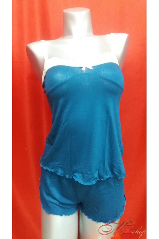 Кокетливая пижама. Цвета морской волны. Майка на тонких регулируемых бретелях, V-образный вырез декорирован контрастным кружевом. Легенькие корткие шортики. Выполнена из качественной вискозы, которая отлично сохраняет свои качества.