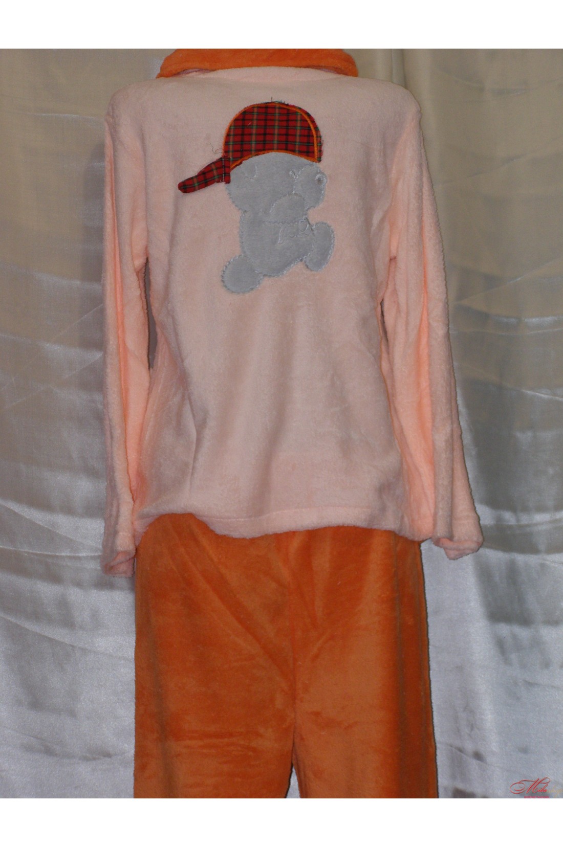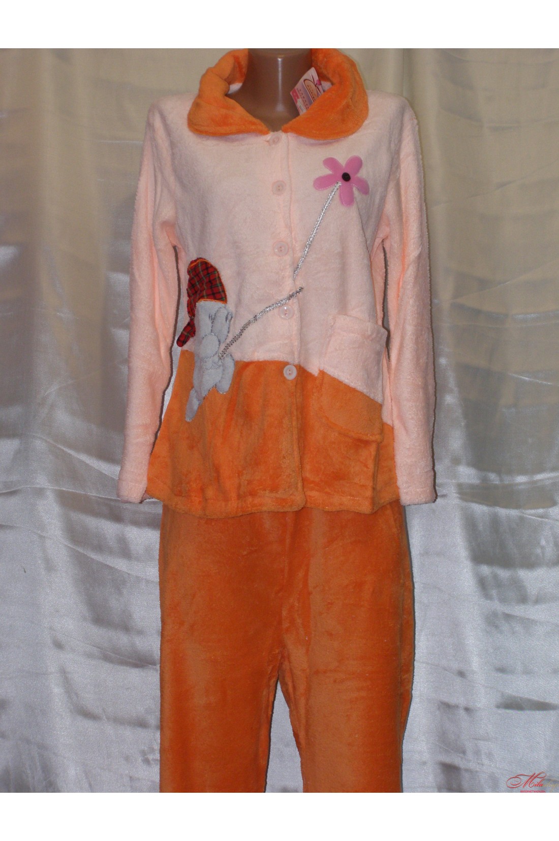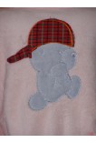 Теплая, нежная пижама со штанами, Футболочка на пуговицах, с карманом, украшена апликациями в виде мишки и цветочка.