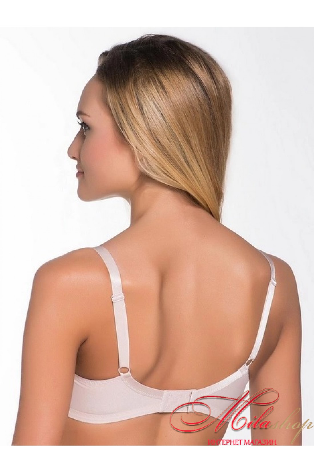 Бюстгальтер із м'якими чашками без каркасів. В основі чашки конструкція з трьох деталей із горизонтальним швом. Чашка та стан з еластичної бавовни. Чашки на дубляжі з бавовною. Передня частина бічної деталі стану дубльована нееластичною бавовною. Уздовж верхнього зрізу бюстгальтера лаконічна окантовка. Оздоблення - маленькі бантики на місцях з'єднання бретелі з чашкою. Бретели не знімні, регулюються по довжині.