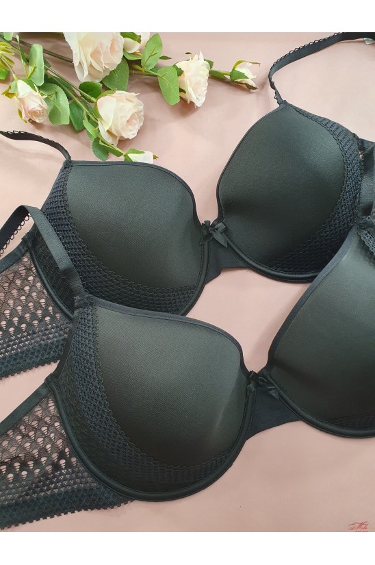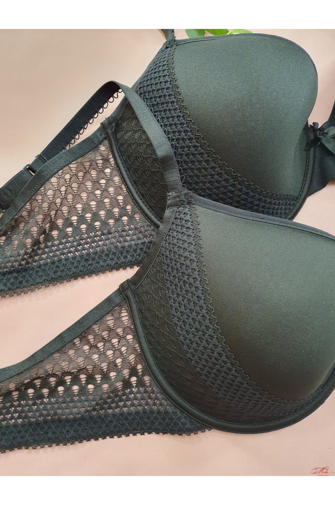 Базовий гладкий бюстгальтер спейсер із тонкого поролону, з гарними вставками мережива. Добре підтримує груди, цікаво прикрашена чашка. Бретельки незнімні та регулюються по довжині.