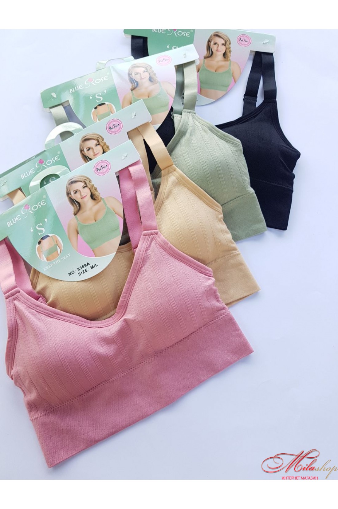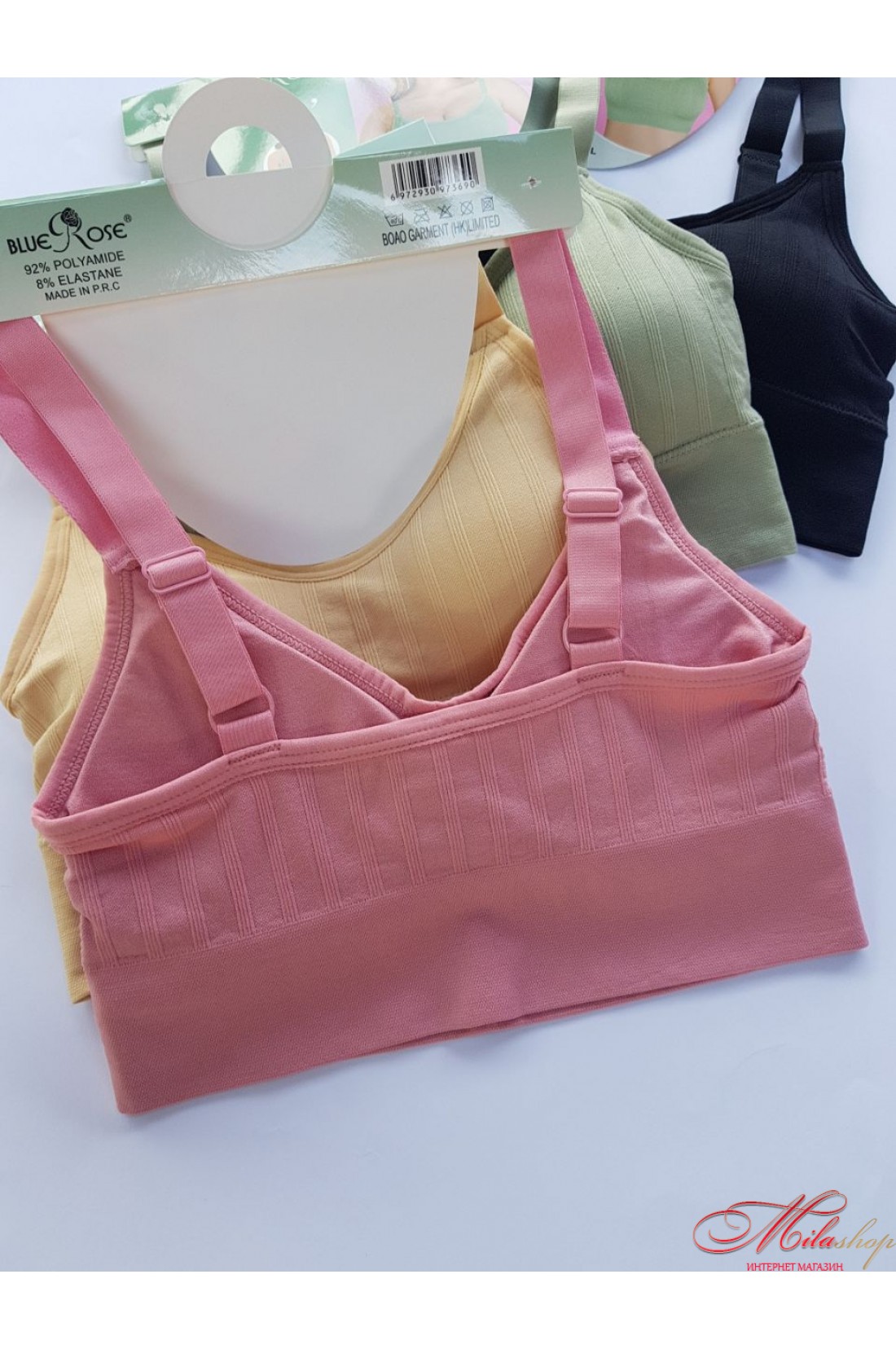 Комфортний топ, без кісточок, за рахунок вкладиша з невеликим пуш-ап, приємний на дотик, не знімні бретелі, регулюються по довжині. Добре підтримує груди.