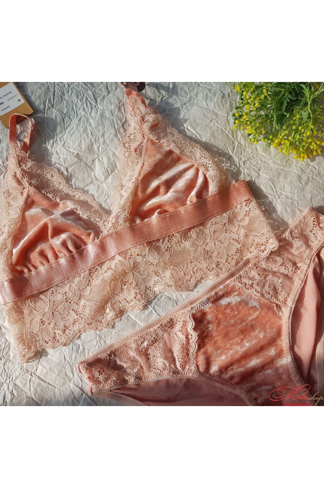 Безкаркасный комплект состоит из нежного браллета с кружева и велюра. Трусики слипы тоже спереди украшены велюром и кружевом.