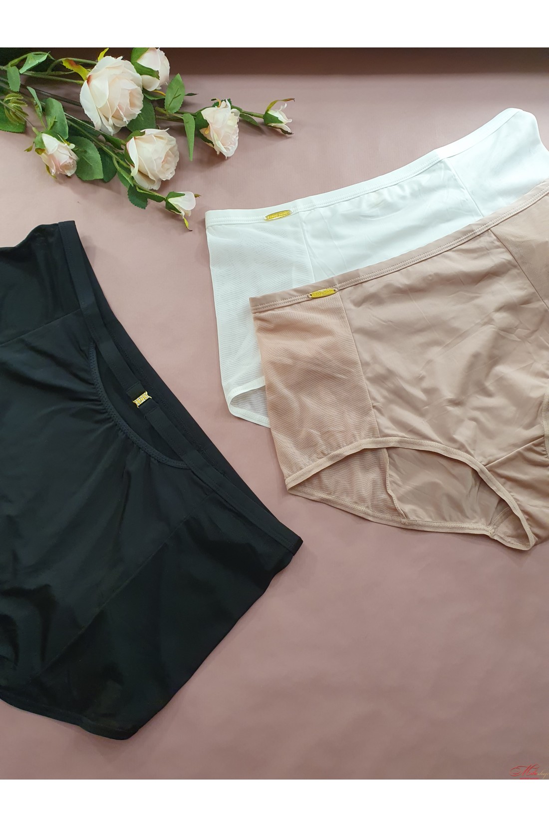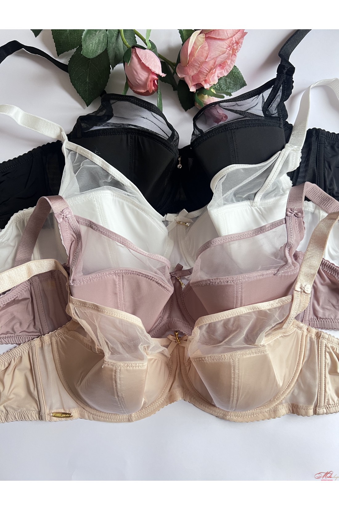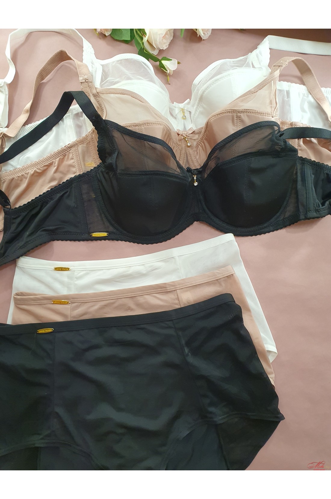 Бюстгальтер на кісточках, чашка виготовлена з напівпоролону і верхня частина прикрашена гарним сітчастим полотном. За рахунок своєї конструкції бюстгальтер добре тримає груди. Трусики сліпи з мікрофібри та сітчастого полотна.
