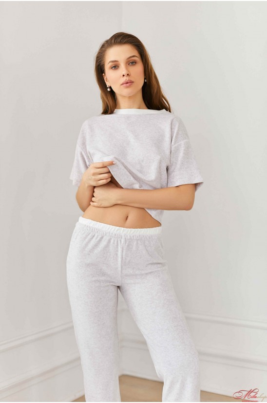 Комплект для будинку з велюру та бавовни. М"яке полотно приємне до тіла, добре пропускає повітря та вбирає вологу, не дратує шкіру. Футболка прямого крою, подовжені рукави. Прямі штани утримуються на талії вшитою резинкою.