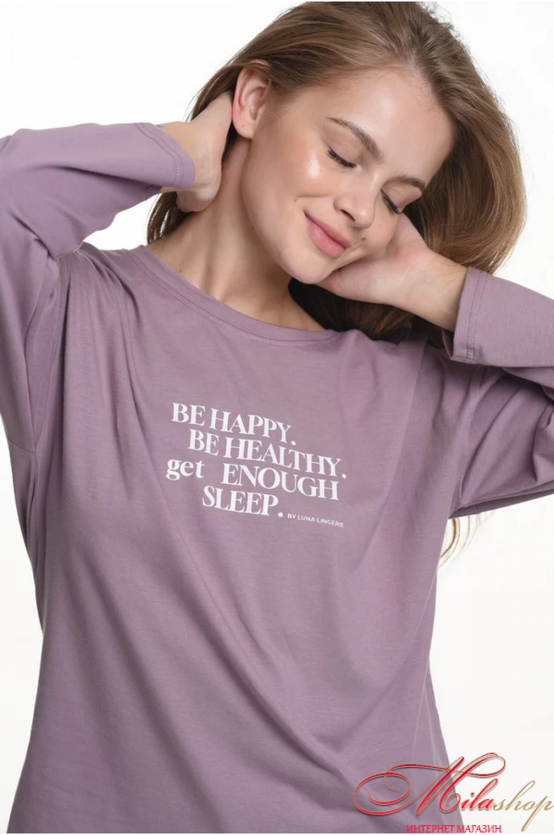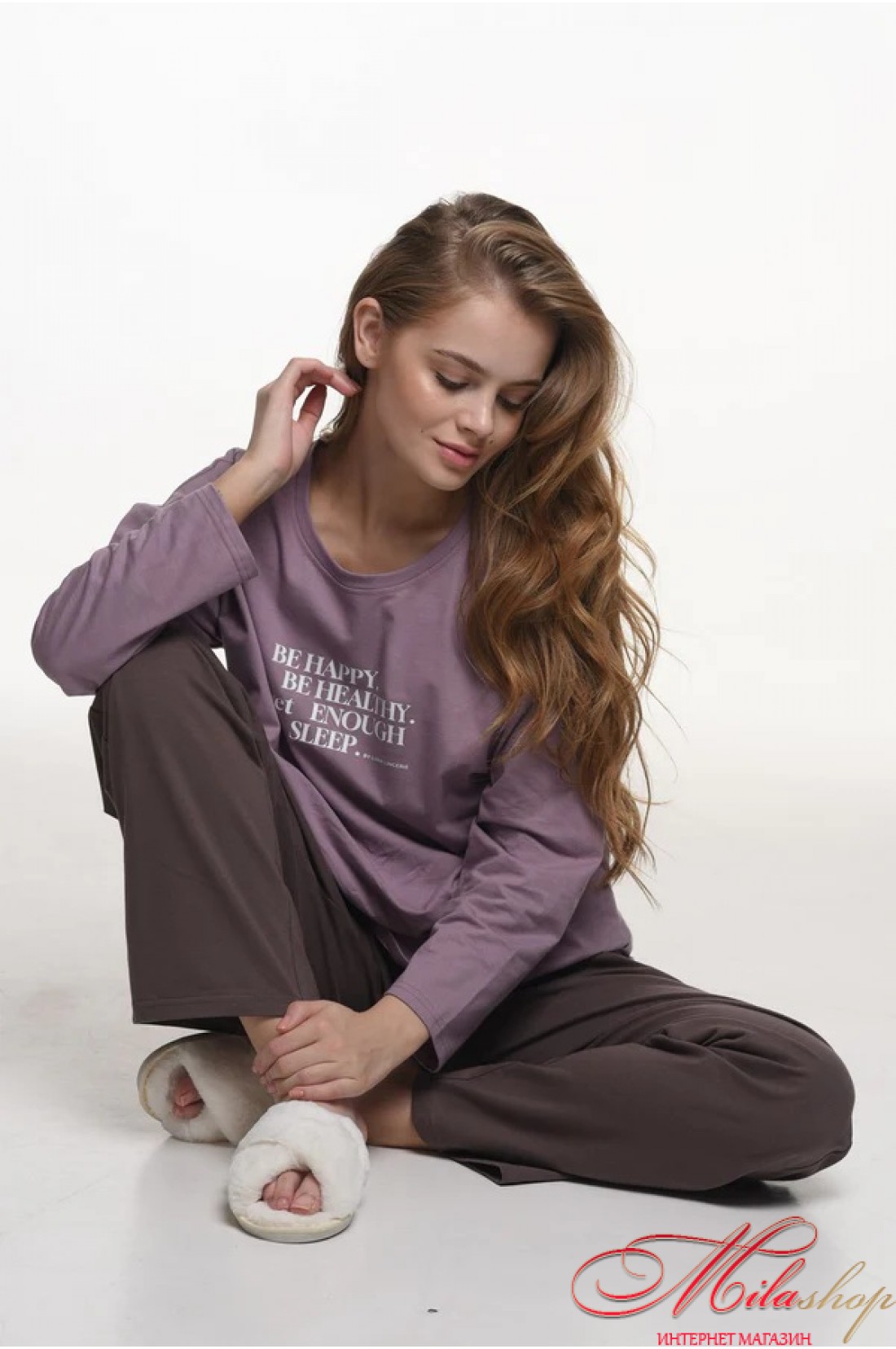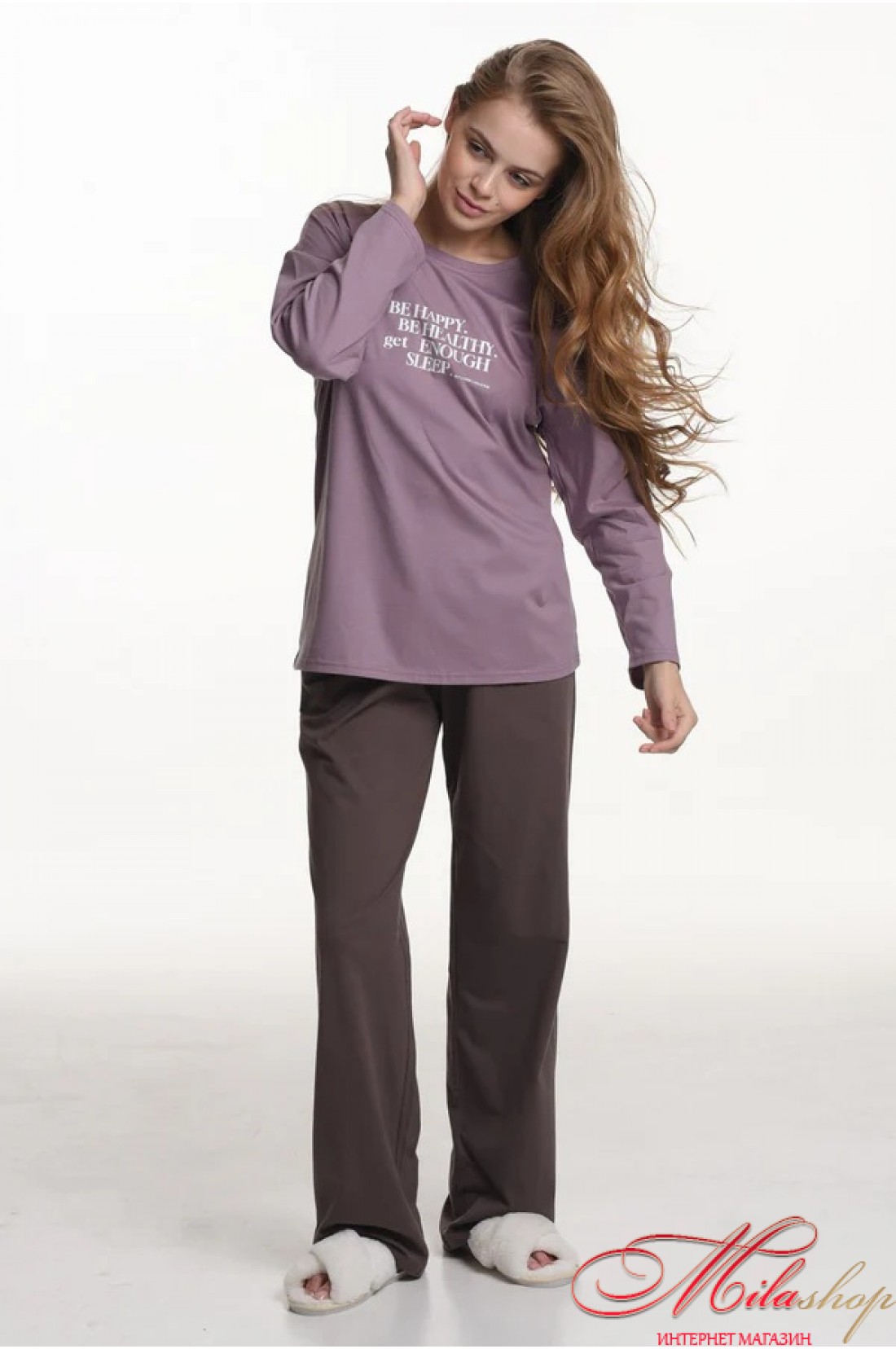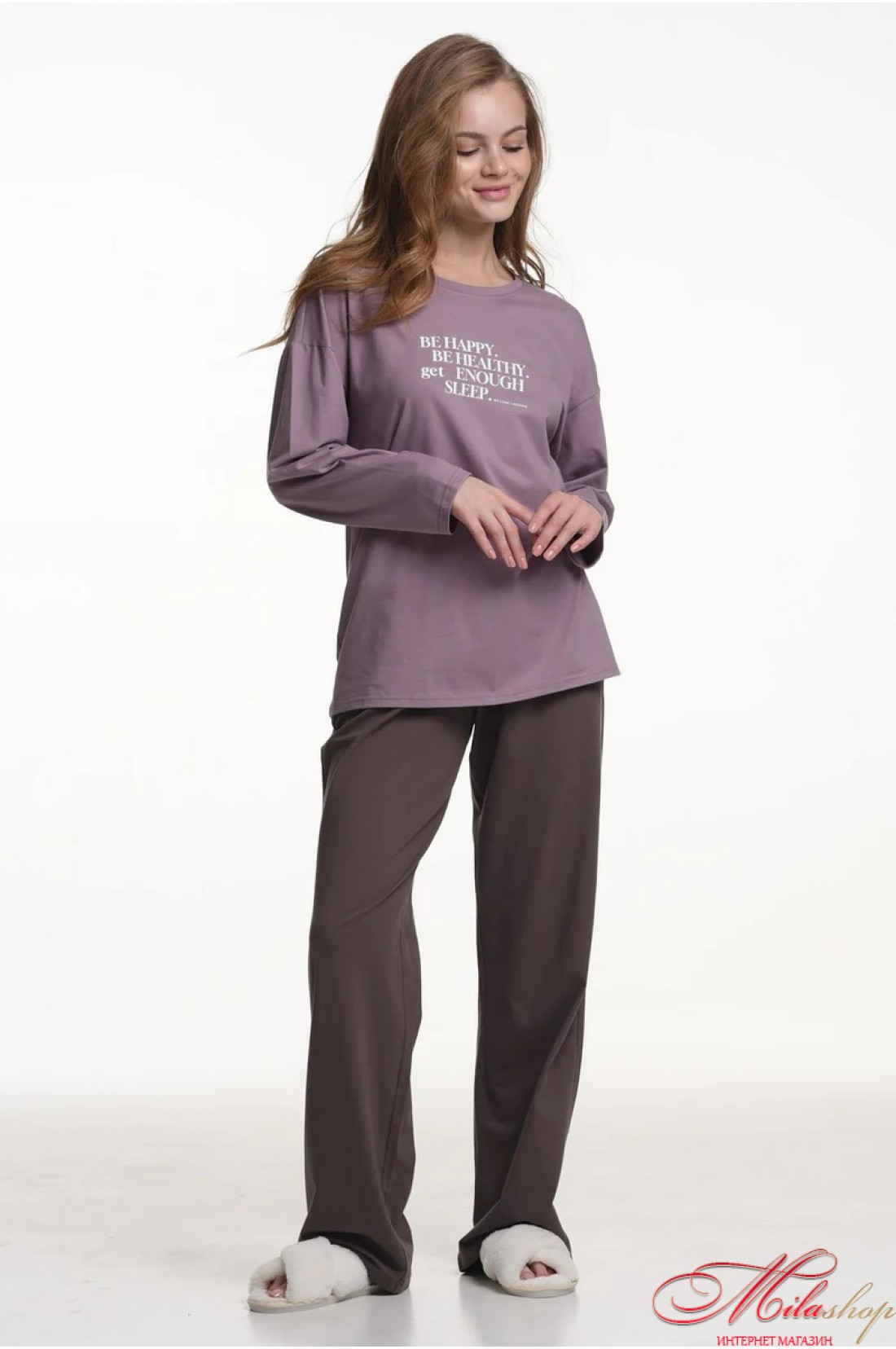 Піжама з бавовни для відпочинку та сну. Бавовняне полотно не подразнює шкіру, не викликає алергію, добре вбирає вологу та пропускає повітря. Кофта з довгими рукавами, круглий виріз горловини. Штани утримуються на поясі м'якою гумкою, середня лінія талії.