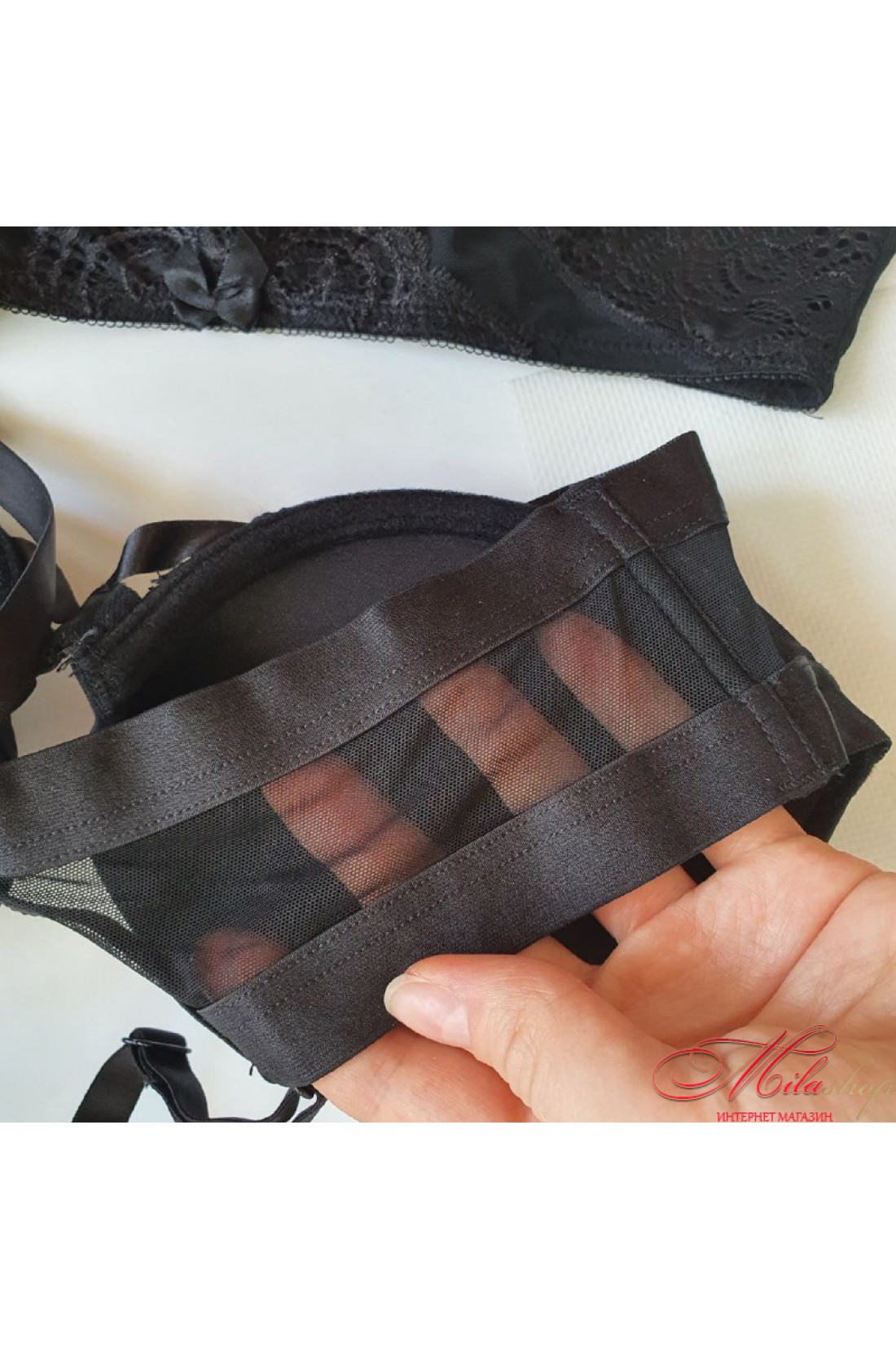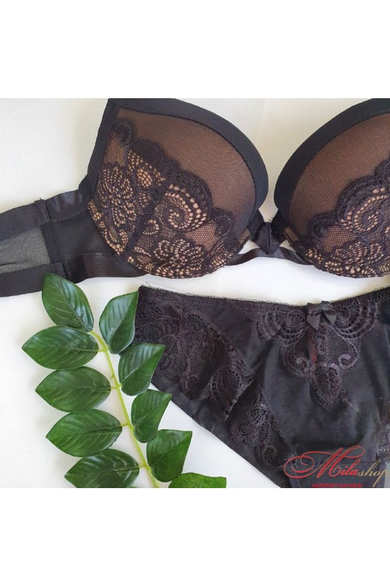 Изумительный комплект, состоит из бюстгальтера с комфортным пуш-ап и трусиков. Выполнен из кружева, сетчатого полотна и украшен атласными лентами. Бретели по длине регулируются. Трусики бразильяны, ластовица хлопок.