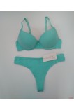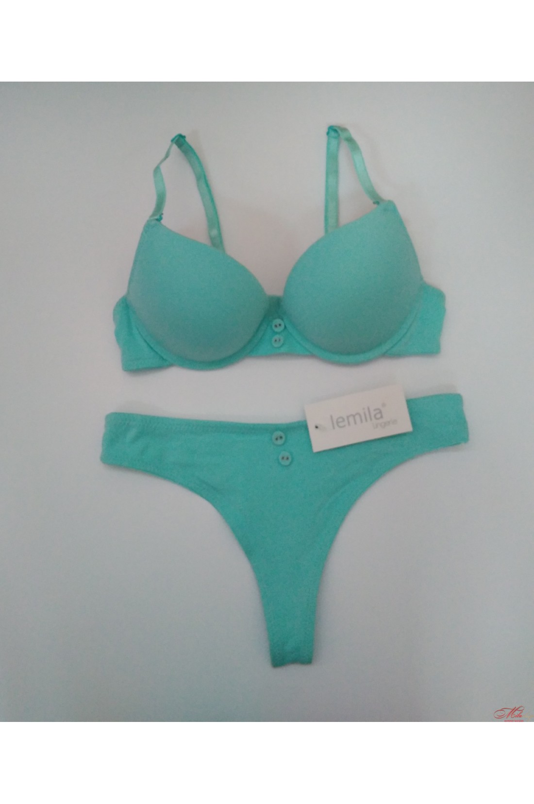 Хлопковый комплект с push up на поролоне, с формованными чашками на стане. Комплект выполнен из хлопка, в цвете меланж и в мятном цвете. Аксессуар - две пуговички. Отстегивающиеся бретели. В комплекте трусики стринг.