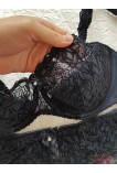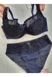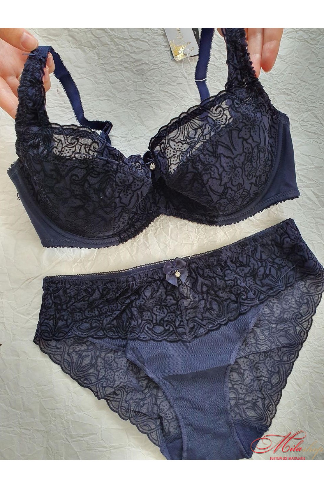 Бюстгальтер полу-поролон, с широкими бретелями. Чашечки украшены флоковым рисунком. Роскошные трусики со средней линией талии. Передняя часть трусиков выполнена из хлопка с накладным сетчатым полотном, задняя часть из нежного сетчатого полотна с узором из флока.