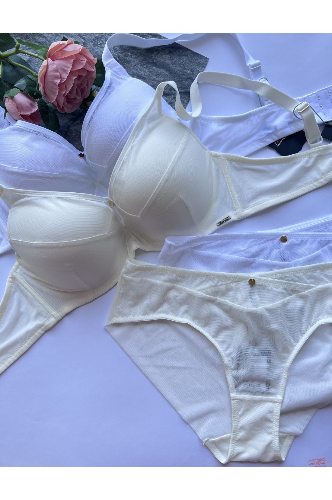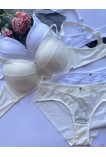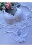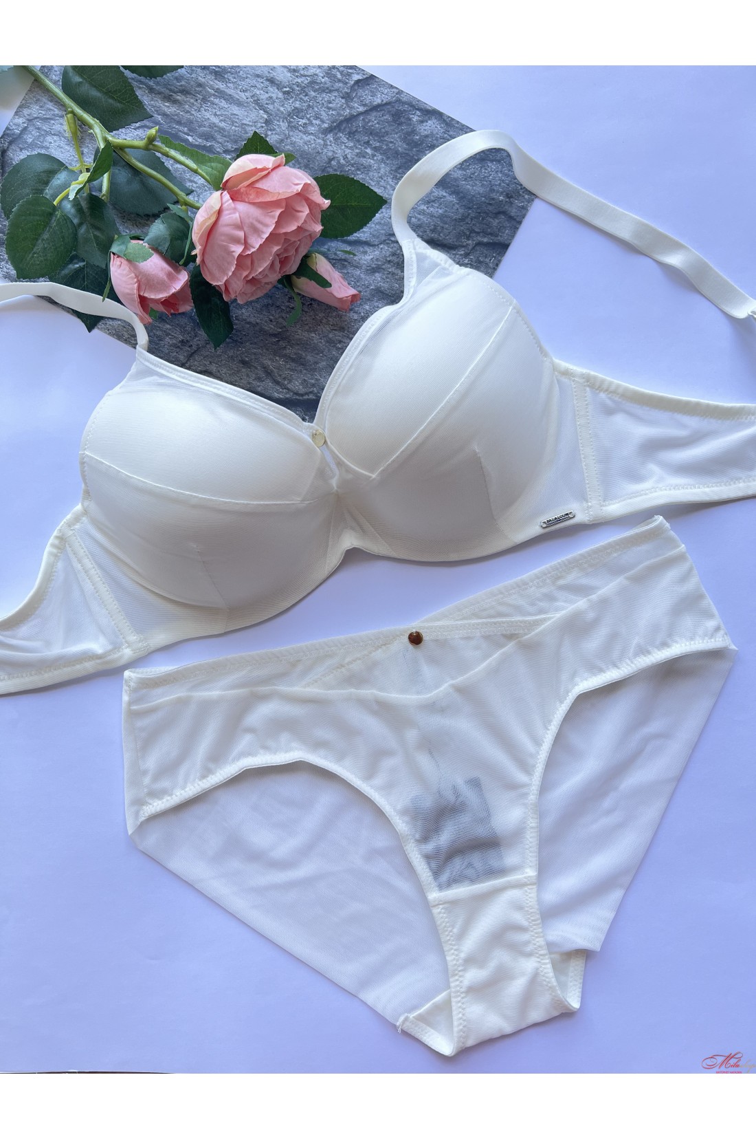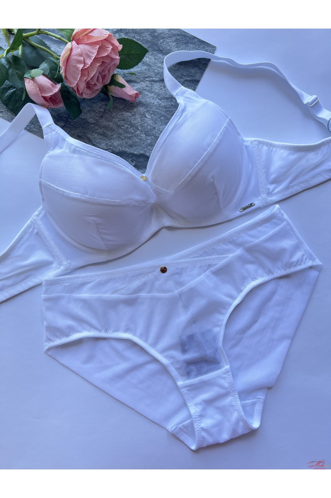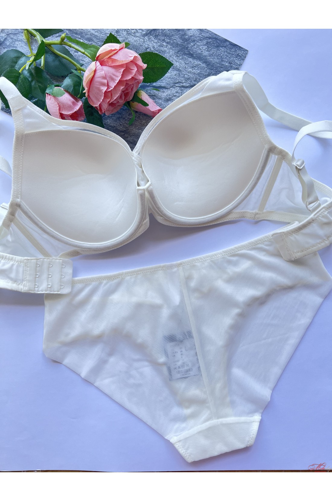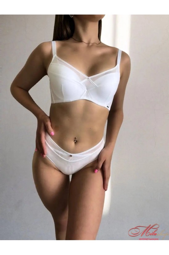 Бюстгальтер з формованими чашками на каркасах виконаний з гладкого еластичного сітчастого полотна. Бретели незнімні, з регулюванням по довжині. Бічні деталі укріплені вертикальними кісточками. Трусики сліпи з мікросітки з гігієнічною бавовняною ластівкою.