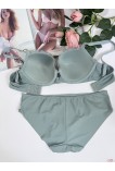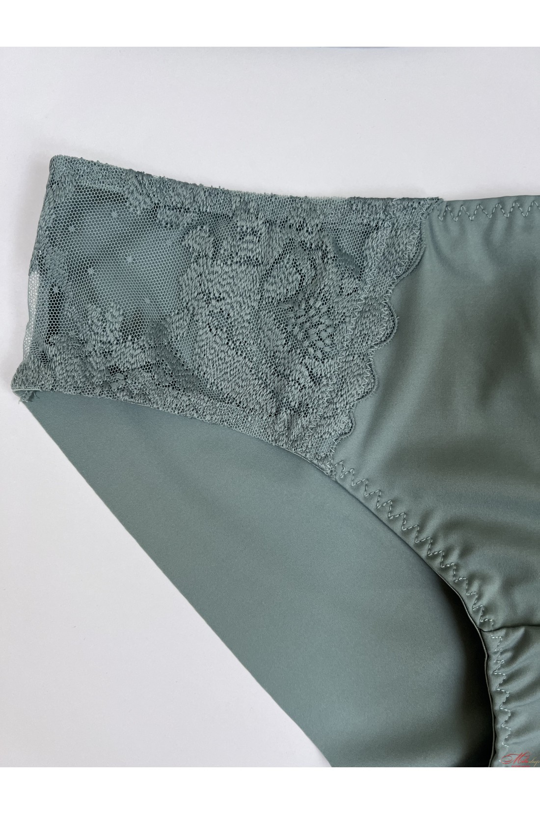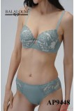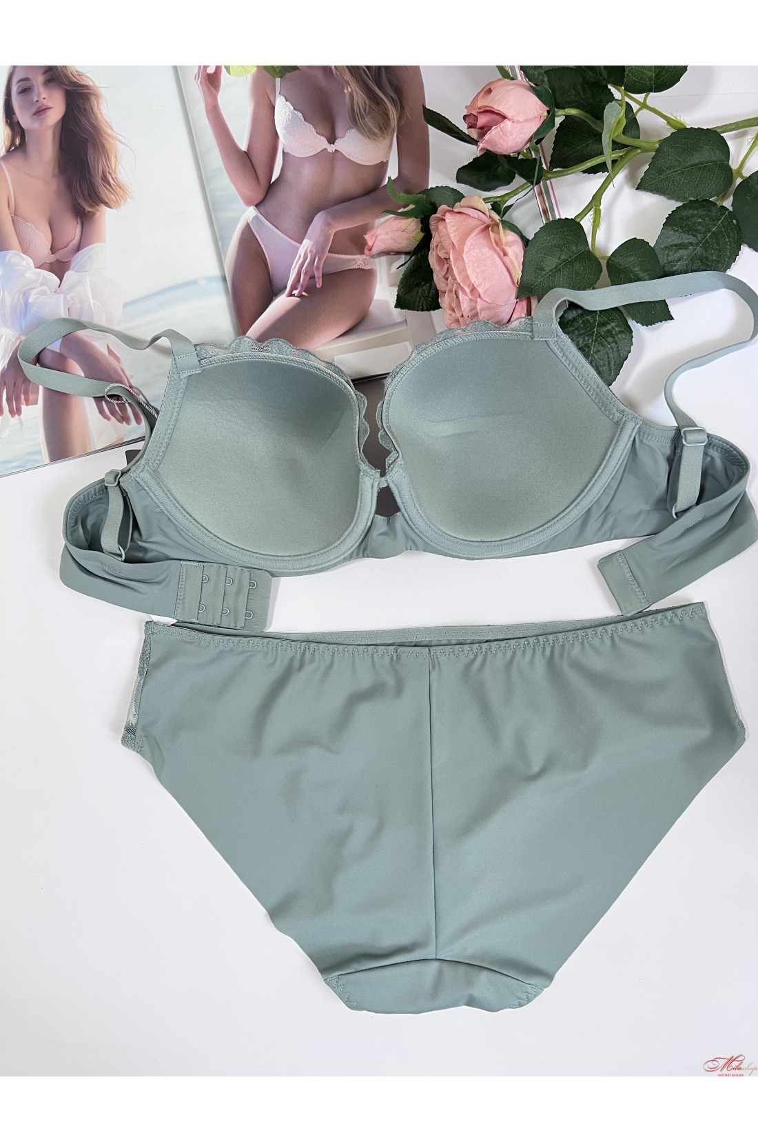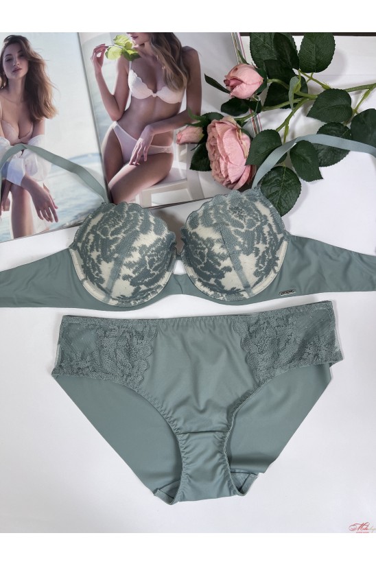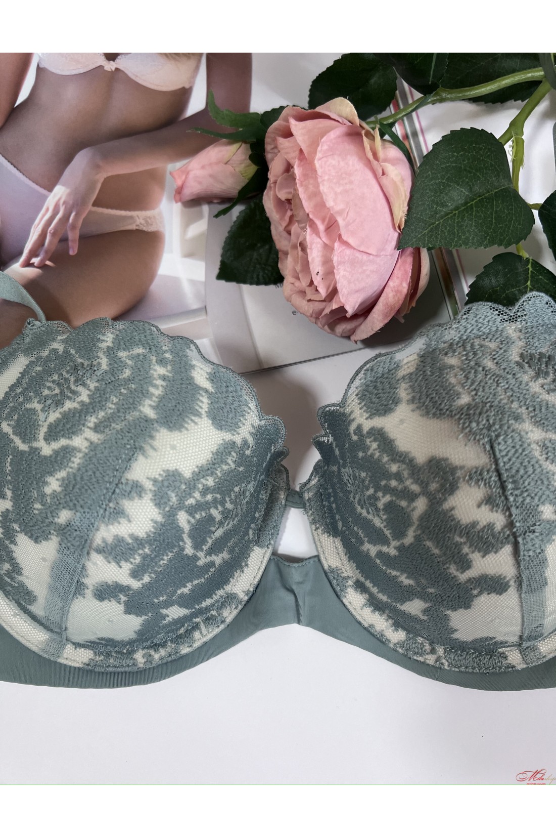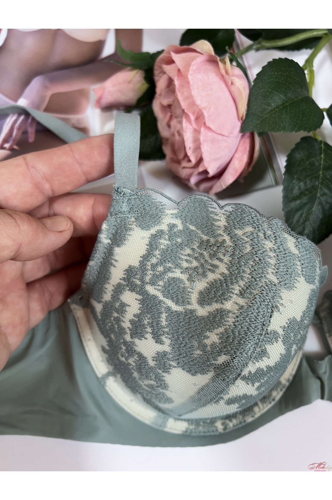 Елегантний та жіночний комплект нижньої білизни виконаний з вишитого мережива з великим квітковим малюнком та фігурним краєм та гладкою еластичною мікрофіброю. Бюстгальтер із формованими чашками із тонкого поролону на каркасах. Чашки зверху покриті мікросіткою з вишивкою, пояс виконаний з мікрофібри з безшовним оздобленням краю. Бретели не відстібаються, регулюються по довжині. Трусики з мікрофібри декоровані мереживними вставками з боків передньої деталі. Задня частина виконана з подвійної мікрофібри із плоскими безшовними краями. Бавовняна ластівка.