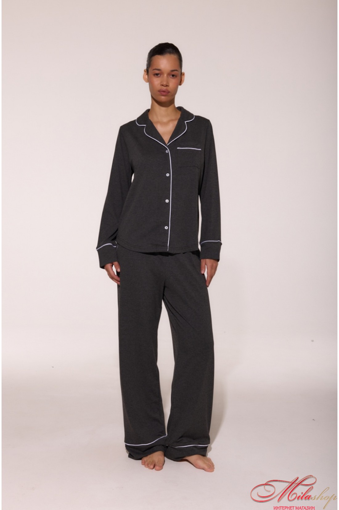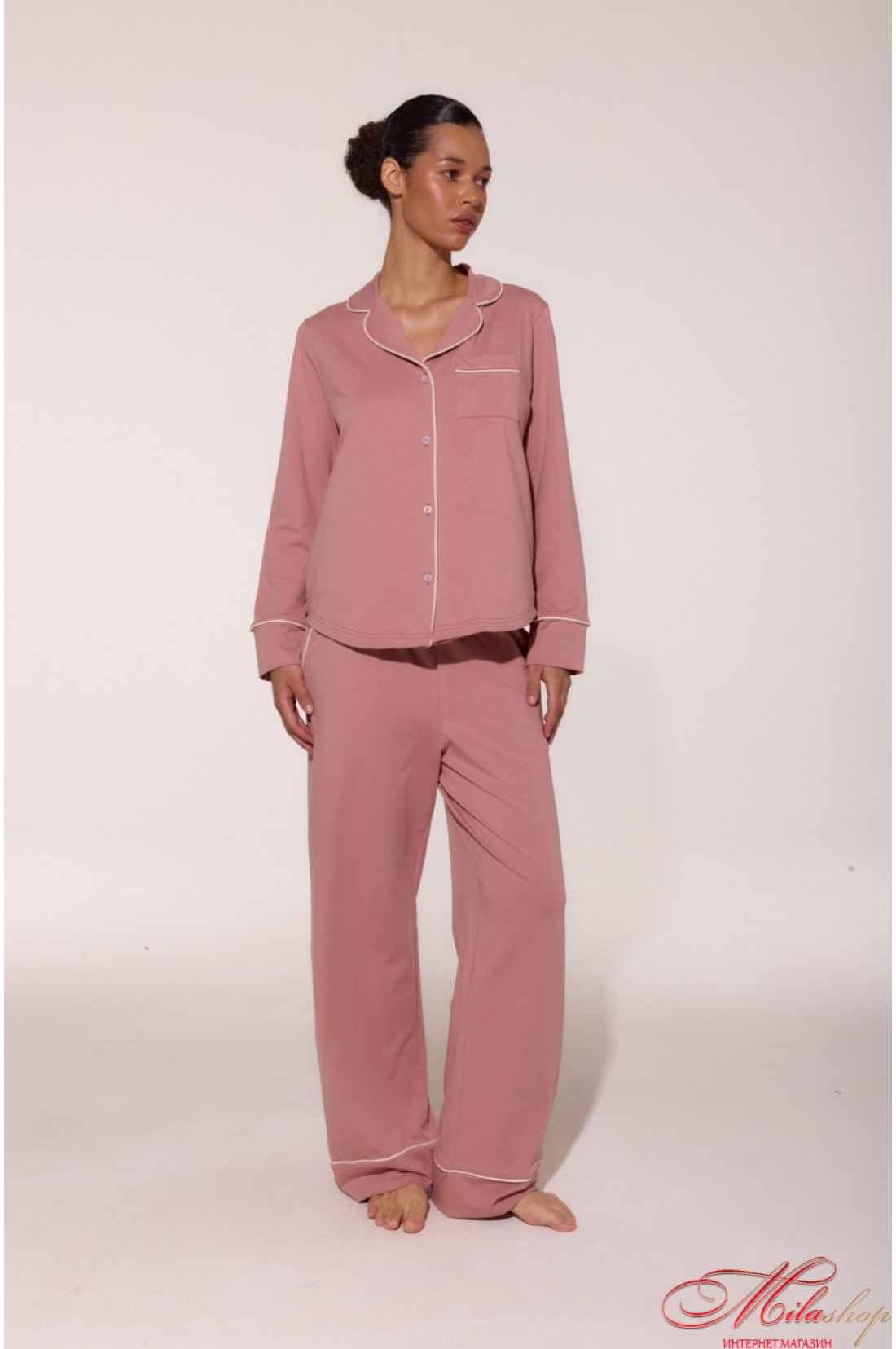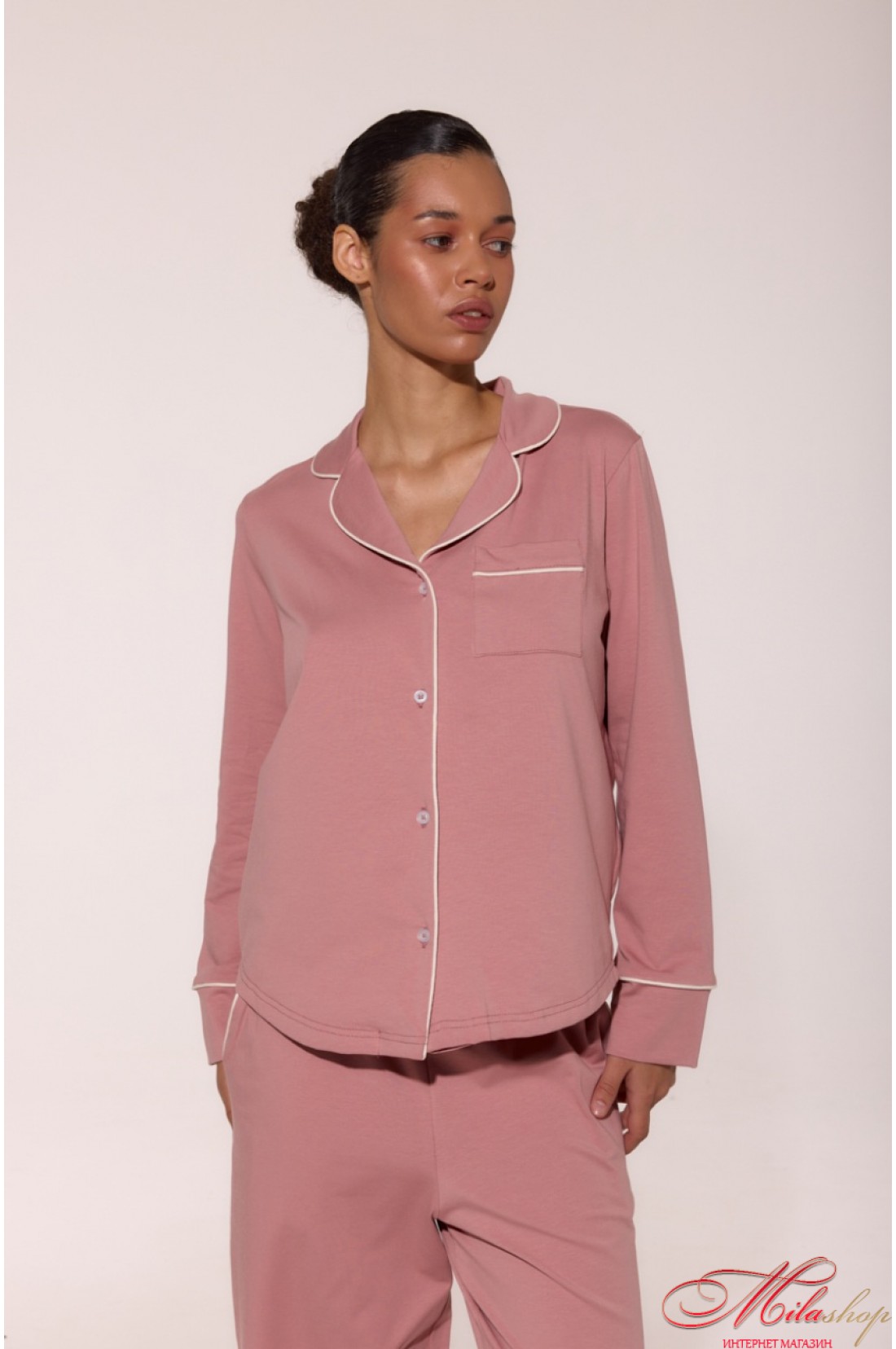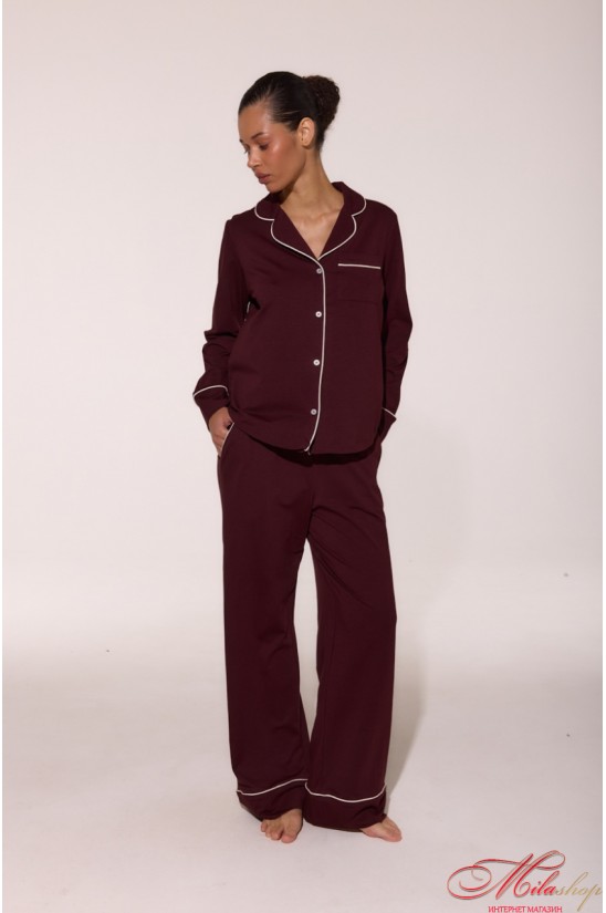 Бавовняна піжама з кантами LP-056 — це поєднання ніжності та стилю. М’який кулір забезпечує комфорт у будь-яку пору року, а акуратні кантові вставки додають витонченості. Сорочка з англійським коміром і накладною кишенею, зручні штани з боковими кишенями та манжетами — ідеальний баланс між класикою та сучасністю. Рекомендації по пранню: при 30 градусах, з подібними кольорами.