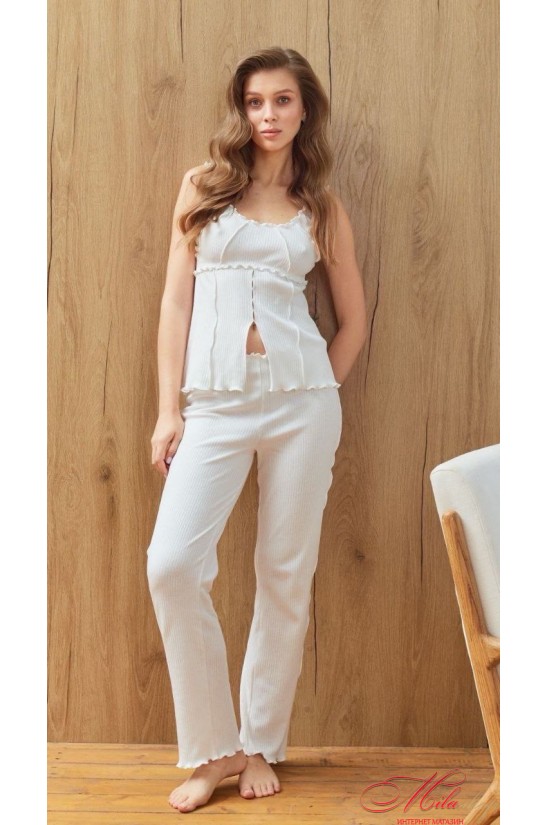 Комфортний комплект майка та штани, виготовлена з бавовни. Майка з широкими бретелями, має розрізи. Штани прямого крою з м'якою гумкою на поясі.