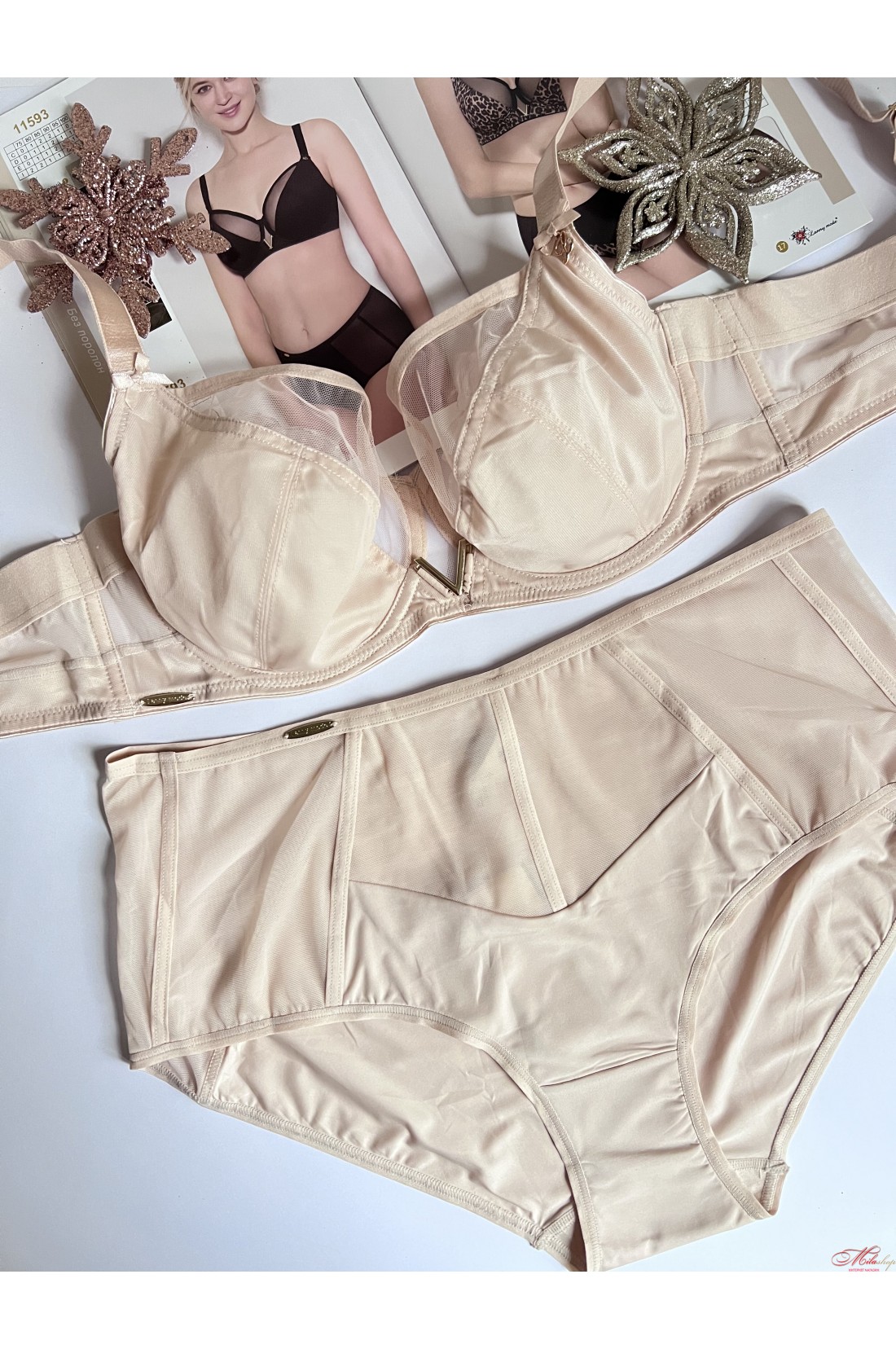 Бюстгальтер з м'якою чашкою на кісточках, прикрашений мікросіточкою. Незнімні бретелі регулюються по довжині. Чудова підтримка для чудових форм! Прекрасні трусики сліпи виконані з мікрофібри, вставками гарної мікросіточки. Завищена лінія талії. М'які, приємні до тіла.