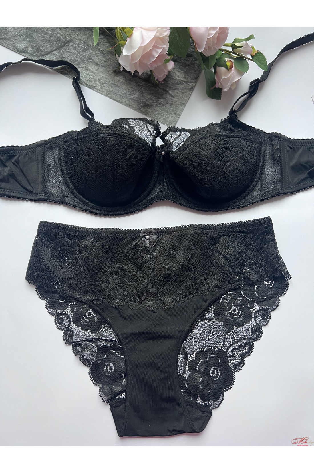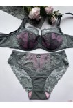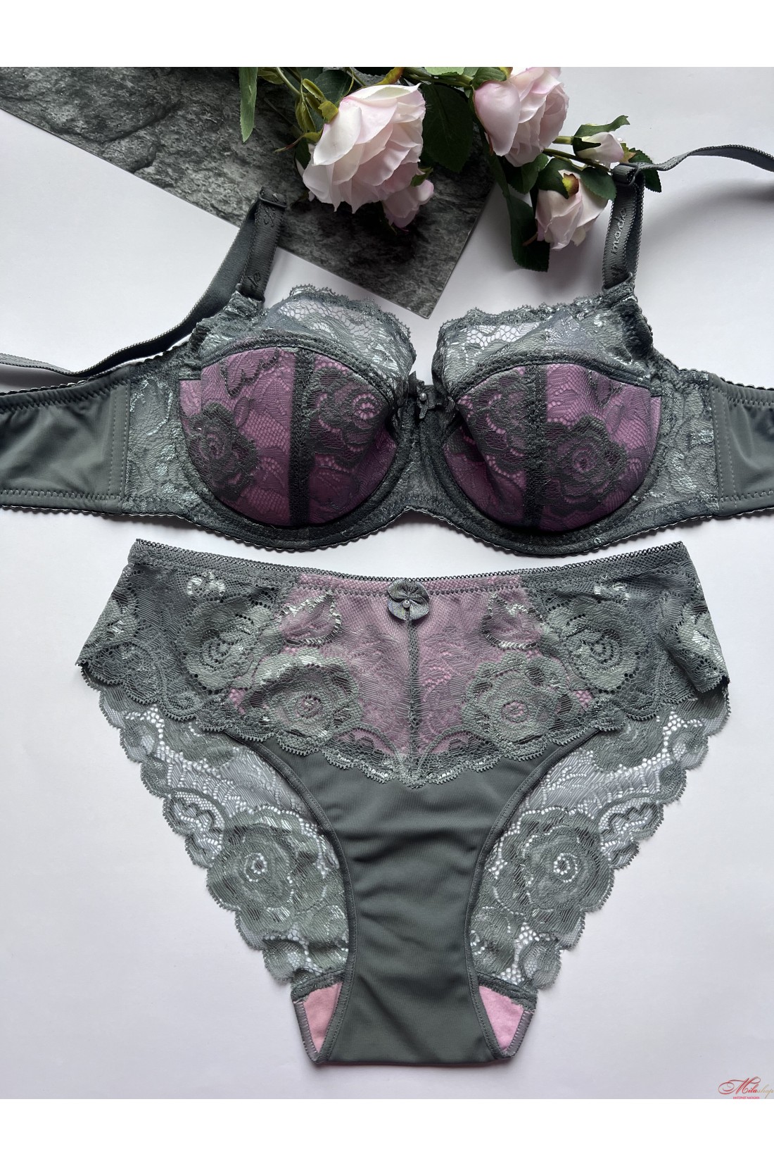 Чашка бюстгальтера на кісточках, на напівпоролоні, на верхній частині прикрашений гарним мереживом. Бретели знімні, регульовані. Трусики сліпи з мікрофібри та мережива, середня лінія талії.