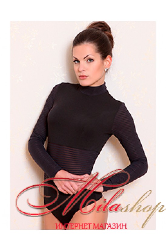 Красивое боди с длинным рукавом. Верхняя и нижняя часть выполнены из нежной вискозной ткани. Рукава и центральная часть из эластичной сетки с горизонтальными полосами.