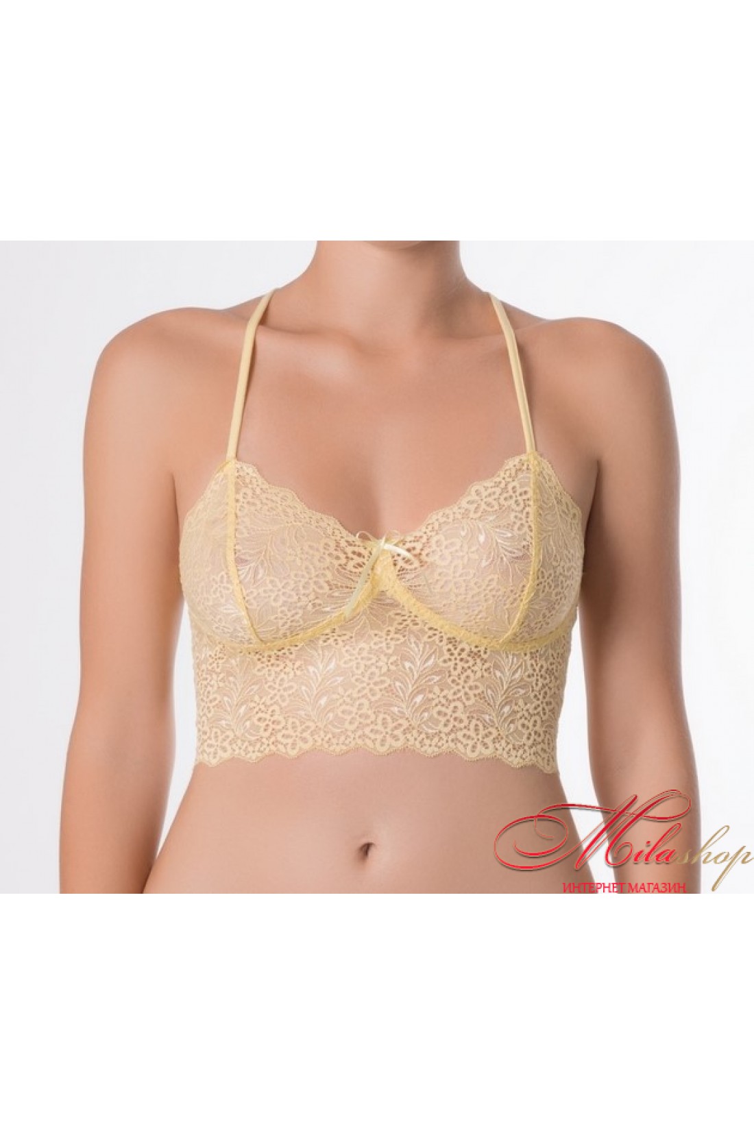 Топ-бюстьє з мережива з регульованими бретельками хрест-навхрест на спинці. М'який і красивий бюстгальтер до якого можна підібрати трусики в тон.