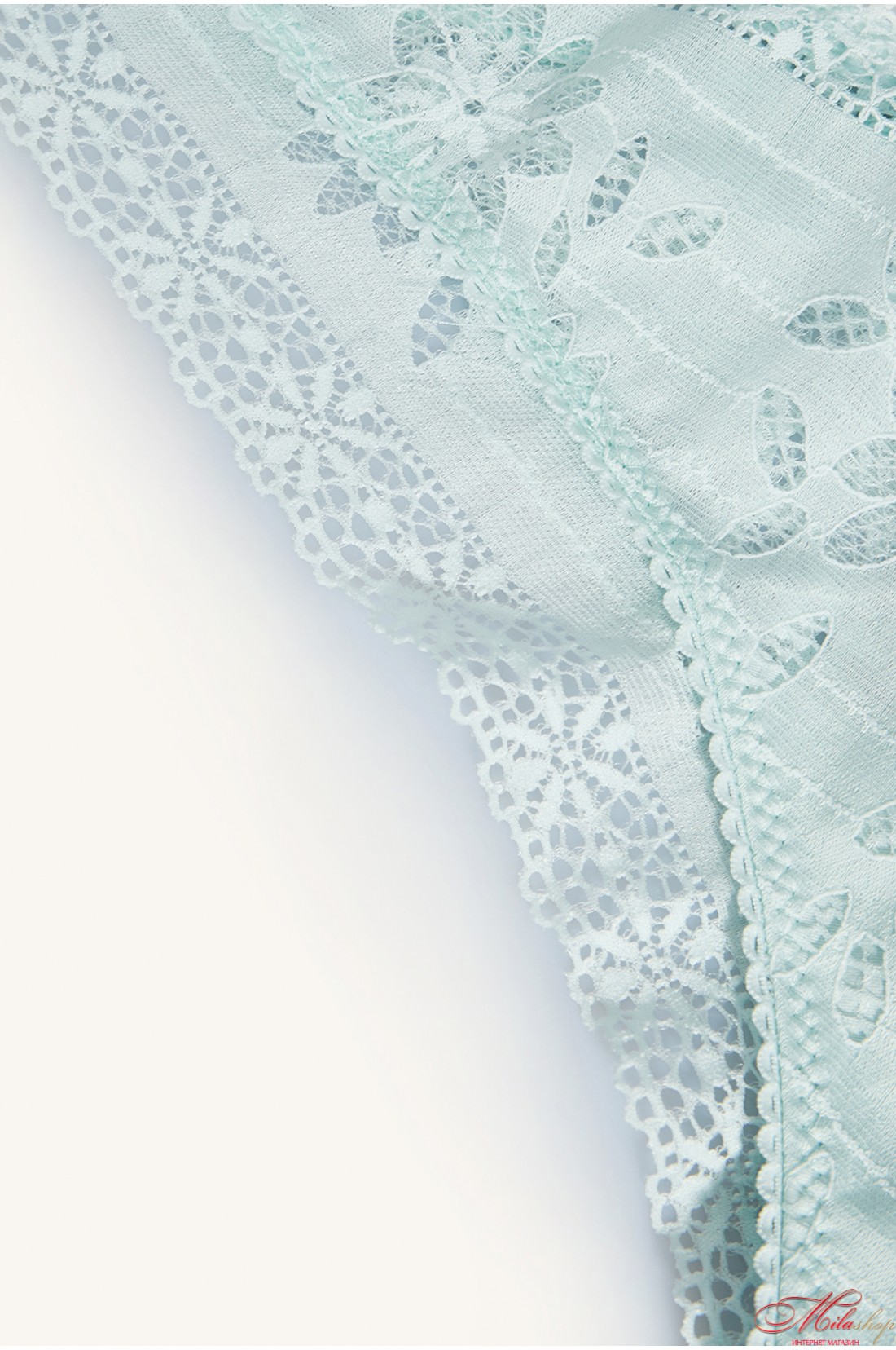 Трусики-бразиліана з мережива підкреслюють сідниці. Лінія талії з V-подібним вирізом. Підвищена лінія стегна. Бавовняна гігієнічна ластівка.