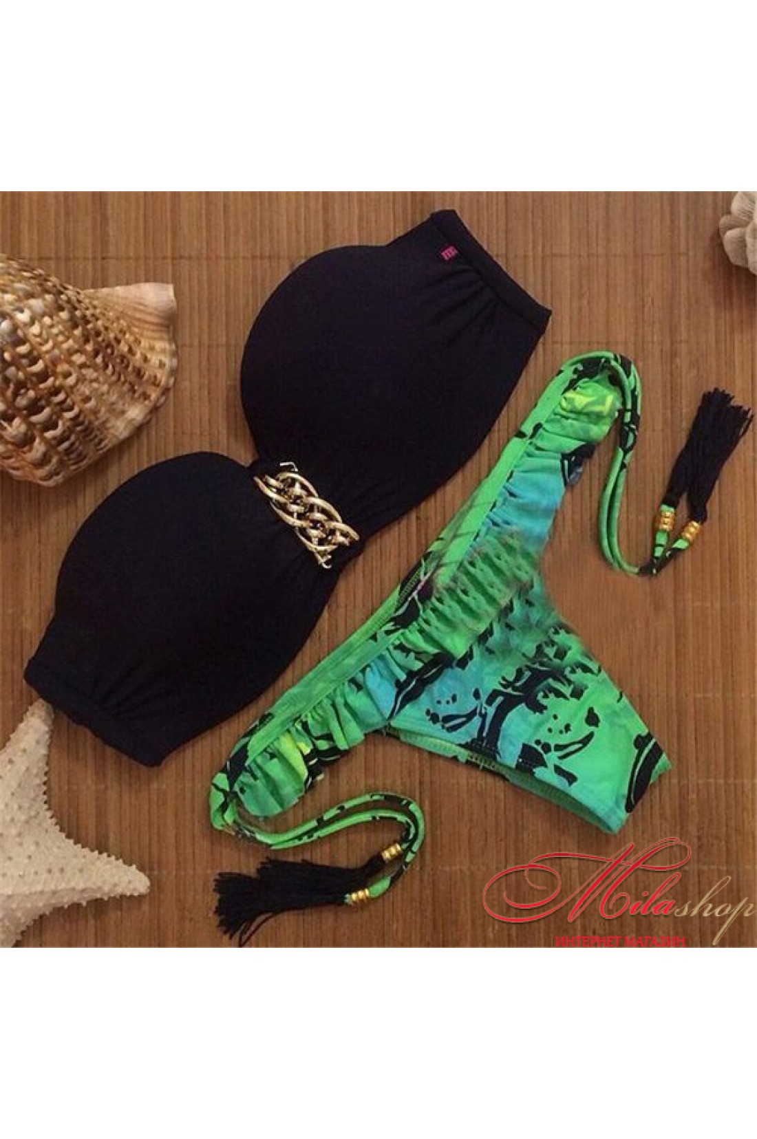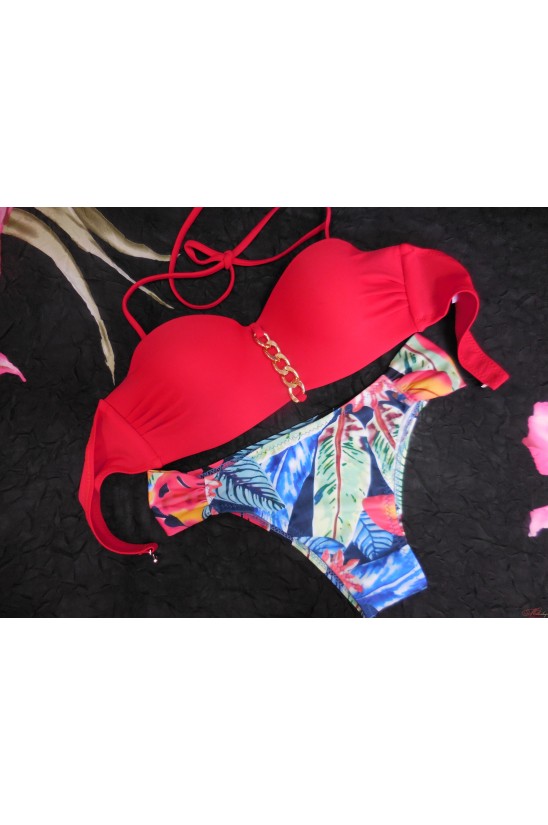 Модный купальник пляжного сезона 2016. Бюстгальтер бандо, украшен декоративным элементом - цепь. Трусики с низкой линией талии.