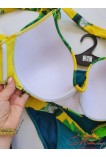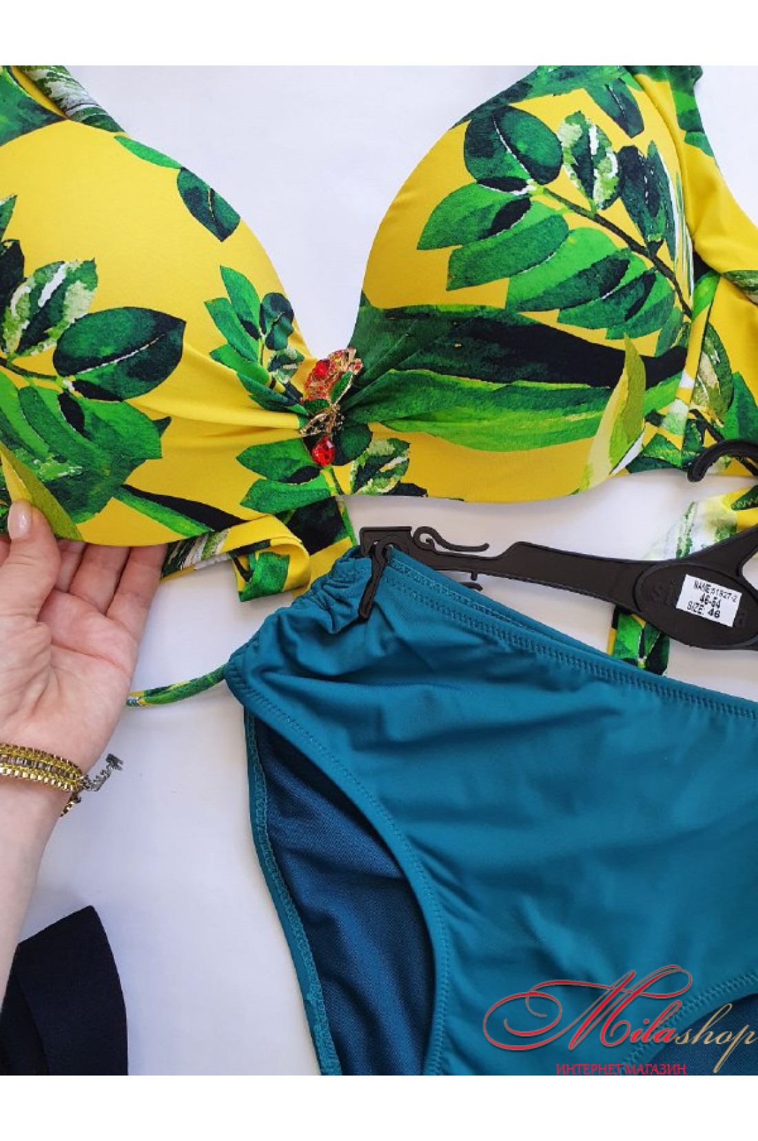 Роздільний купальник для великих грудей. Бюстгальтер на зав'язках, із щільними поролоновими чашками. Завдяки особливому пошиття зближує груди і добре її підтримує. Між чашками прикрашений брошкою, що знімається. Трусики з високою лінією талії.