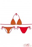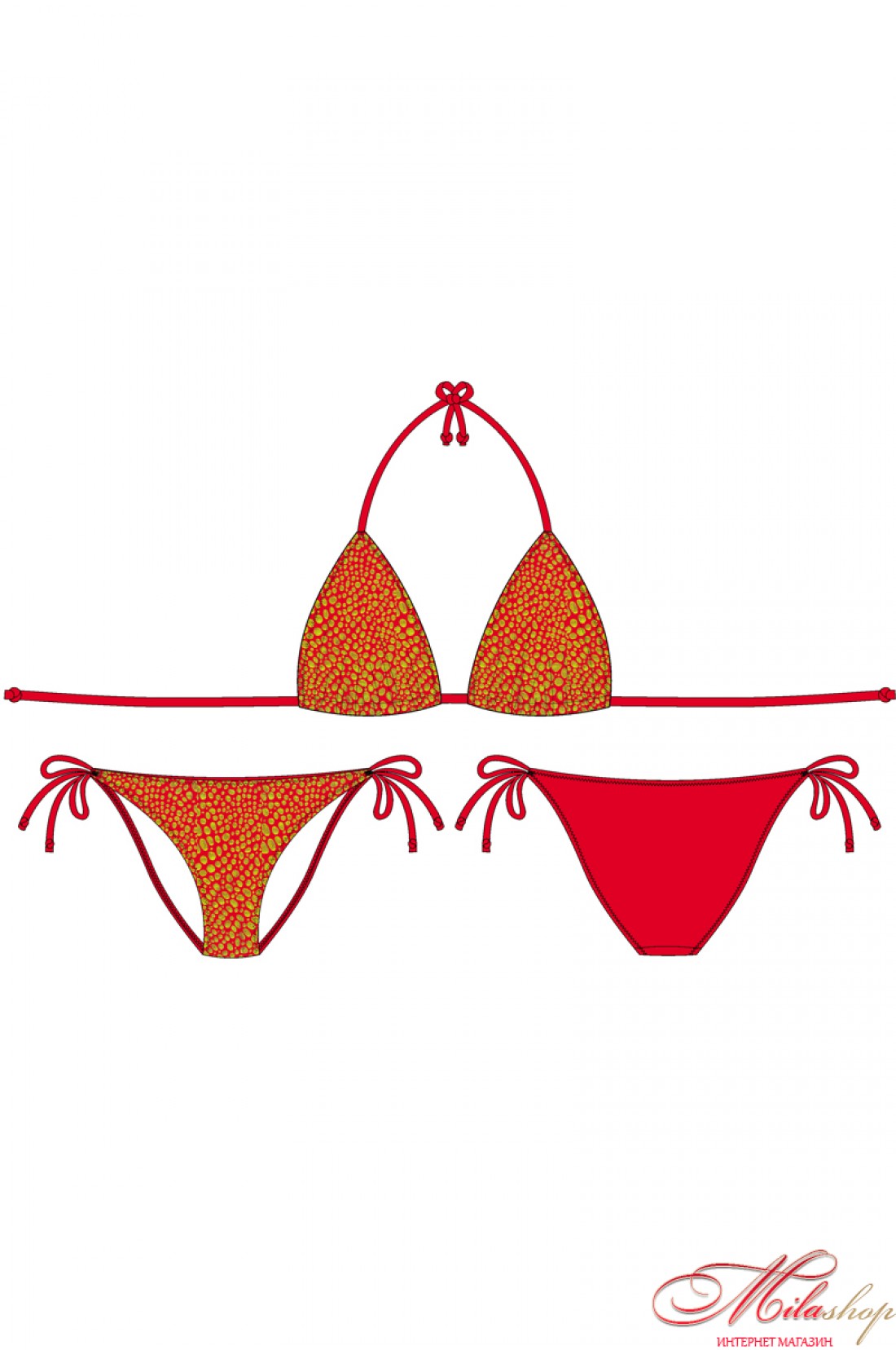 Бюстгальтер с регулируемыми по нижнему краю треугольными чашками из трикотажного полотна, с поролоновыми вкладками и бретелями, завязываются на шее. Плавки с низкой линией талии и завязками по бокам.
