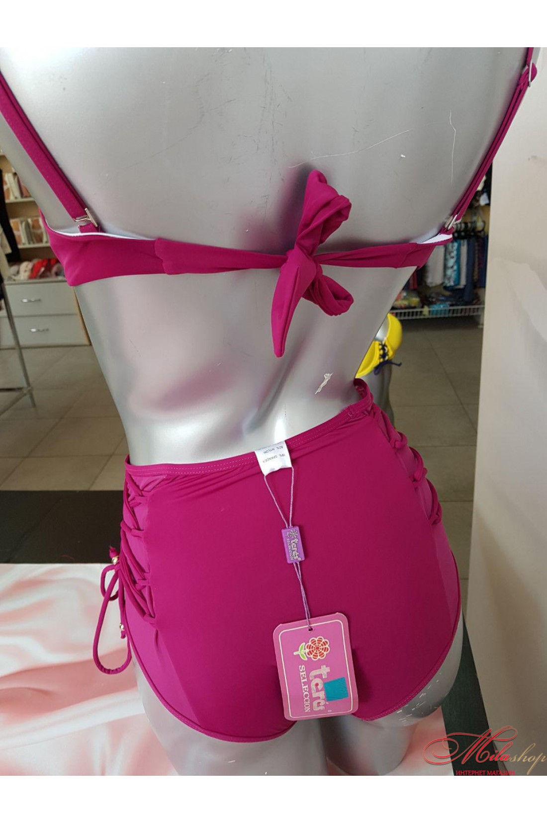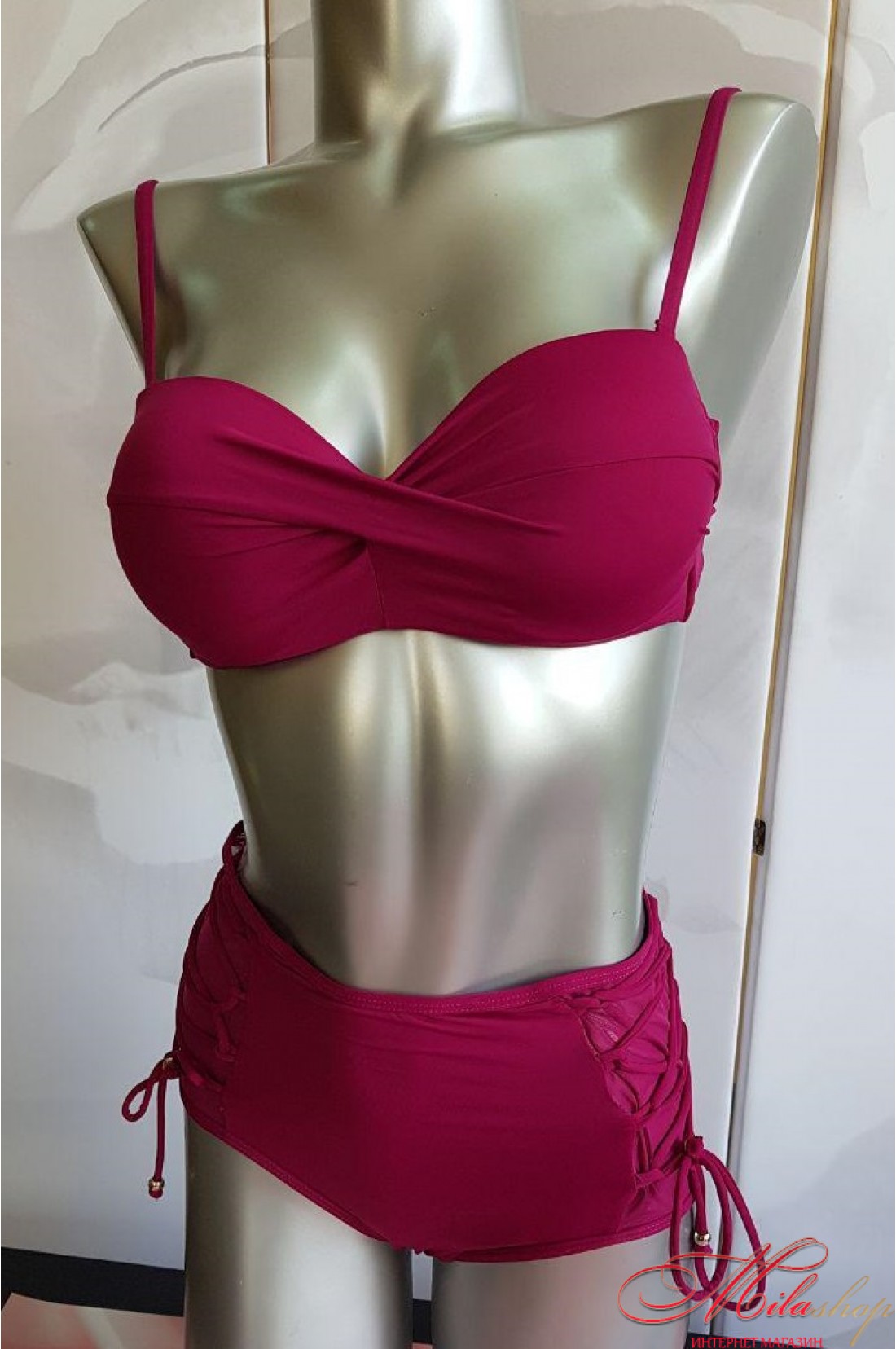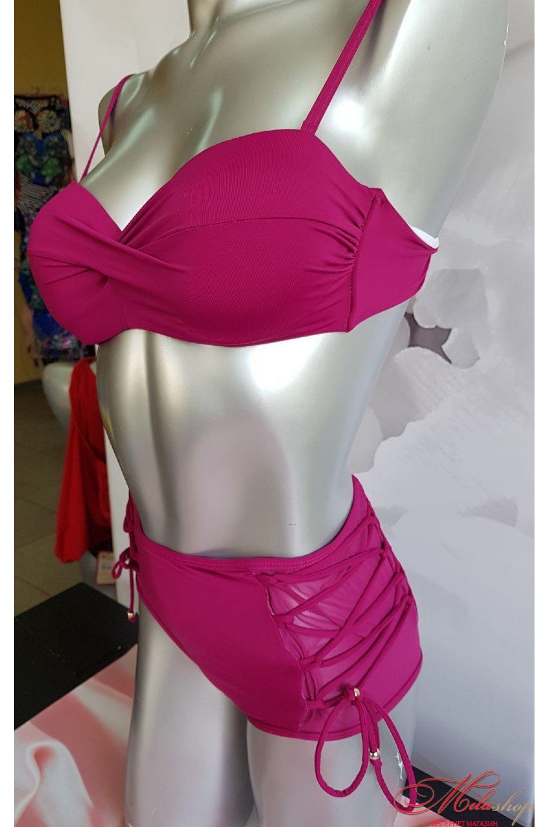 Стильный купальник с ретро-плавками, декорироваными по бокам вставками из сетки и шнуровки.